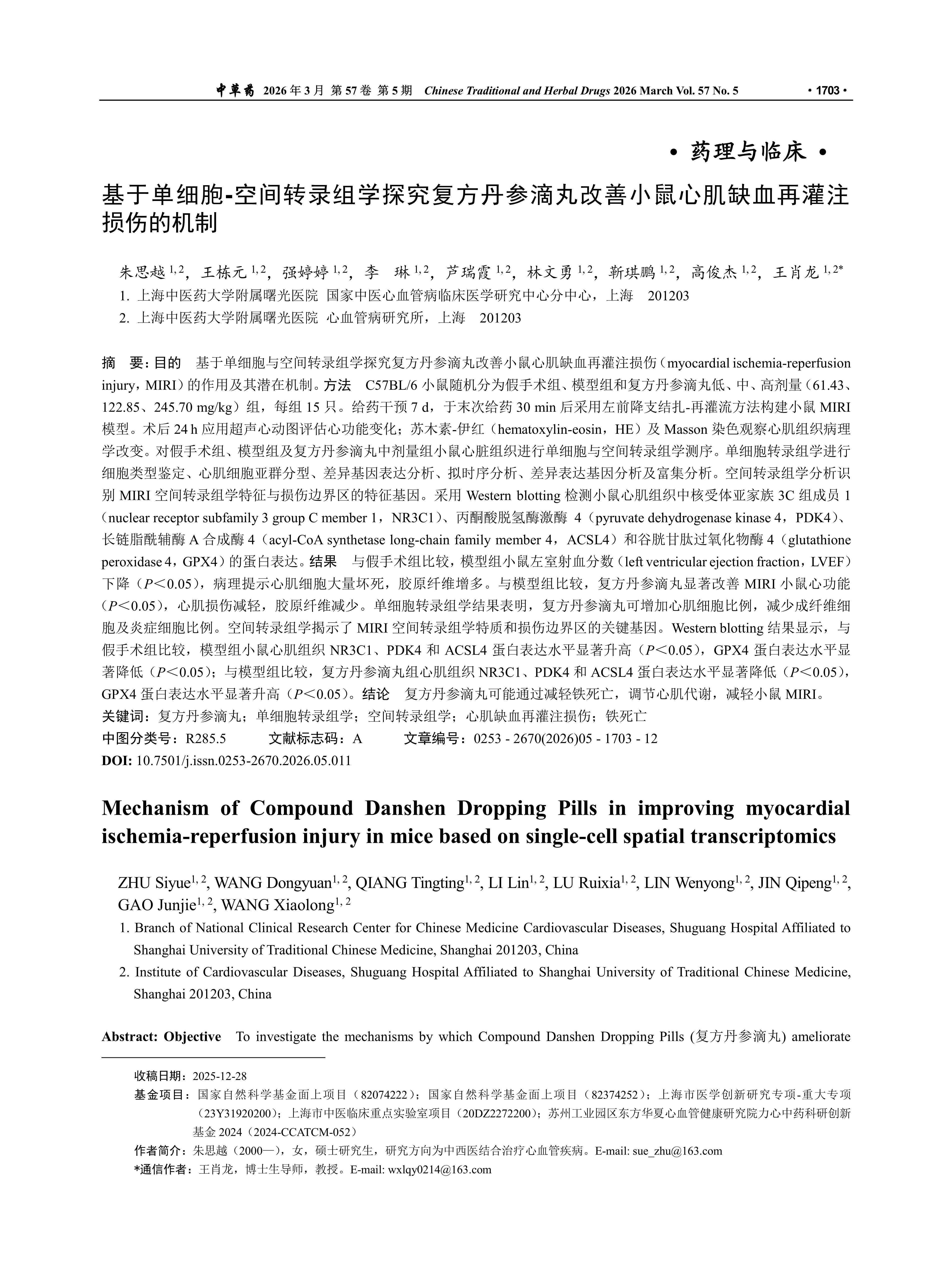基于单细胞-空间转录组学探究复方丹参滴丸改善小鼠心肌缺血再灌注损伤的机制