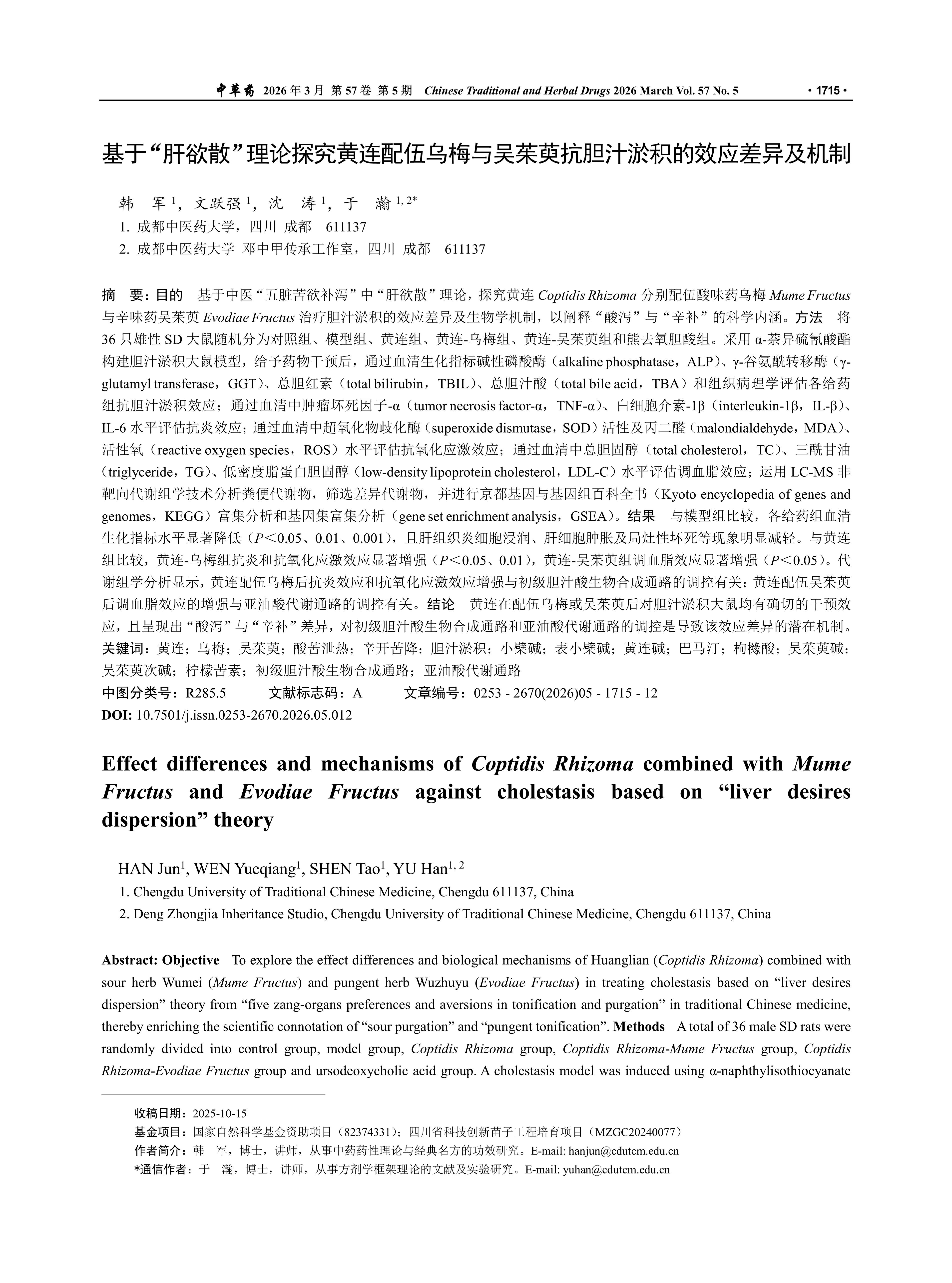 Objective To explore the effect differences and biological mechanisms of Huanglian (Coptidis Rhizoma) combined with sour herb Wumei (Mume Fructus) and pungent herb Wuzhuyu (Evodiae Fructus) in treating cholestasis based on “liver desires dispersion” theory from “five zang-organs preferences and aversions in tonification and purgation” in traditional Chinese medicine, thereby enriching the scientific connotation of “sour purgation” and “pungent tonification”. Methods A total of 36 male SD rats were randomly divided into control group, model group, Coptidis Rhizoma group, Coptidis Rhizoma-Mume Fructus group, Coptidis Rhizoma-Evodiae Fructus group and ursodeoxycholic acid group. A cholestasis model was induced using α-naphthylisothiocyanate (ANIT). After drug intervention, the anti-cholestatic effects were evaluated by measuring serum biochemical markers sun as alkaline phosphatase (ALP), γ-glutamyl transferase (GGT), total bilirubin (TBIL), total bile acid (TBA) and histopathological examination. The anti-inflammatory effects were assessed by measuring levels of tumor necrosis factor-α (TNF-α), interleukin-1β (IL-1β) and IL-6 in serum. The anti-oxidative stress was evaluated by measuring activity of superoxide dismutase (SOD) and levels of malondialdehyde (MDA), reactive oxygen species (ROS) in serum. The lipid-regulating effects were evaluated by measuring levels of total cholesterol (TC), triglyceride (TG) and low-density lipoprotein cholesterol (LDL-C) in serum. LC-MS-based untargeted metabolomics was performed on fecal samples to analyze metabolites, identify differential metabolites, and conducting Kyoto encyclopedia of genes and genomes (KEGG) enrichment analysis and gene set enrichment analysis (GSEA). Results Compared with model group, the serum biochemical index levels of each treatment group were significantly reduced (P < 0.05, 0.01, 0.001), the phenomena of liver tissues inflammatory cell infiltration, liver cell swelling and focal necrosis were significantly alleviated. Compared with Coptidis Rhizoma group, Coptidis Rhizoma-Mume Fructus group demonstrated significantly enhanced anti-inflammatory and anti-oxidative stress effects (P < 0.05, 0.01), while Coptidis Rhizoma-Evodiae Fructus group showed significantly enhanced lipid-regulating effects (P < 0.05). Metabolomics analysis indicated that the enhanced anti-inflammatory and anti-oxidative stress effects following the combination of Coptidis Rhizoma with Mume Fructus were associated with the modulation of primary bile acid biosynthesis pathway, the enhanced lipid-regulating effect following the combination of Coptidis Rhizoma with Evodiae Fructus was linked to the regulation of linoleic acid metabolism pathway. Conclusion Coptidis Rhizoma, whether combined with Mume Fructus or Evodiae Fructus, exerts definite interventional effects on cholestatic rats, demonstrating the differential characteristics of “purgation with sour herbs” and “tonification with pungent herbs”. The modulation of primary bile acid biosynthesis pathway and linoleic acid metabolism pathway represents the potential mechanism underlying these differential effects.
