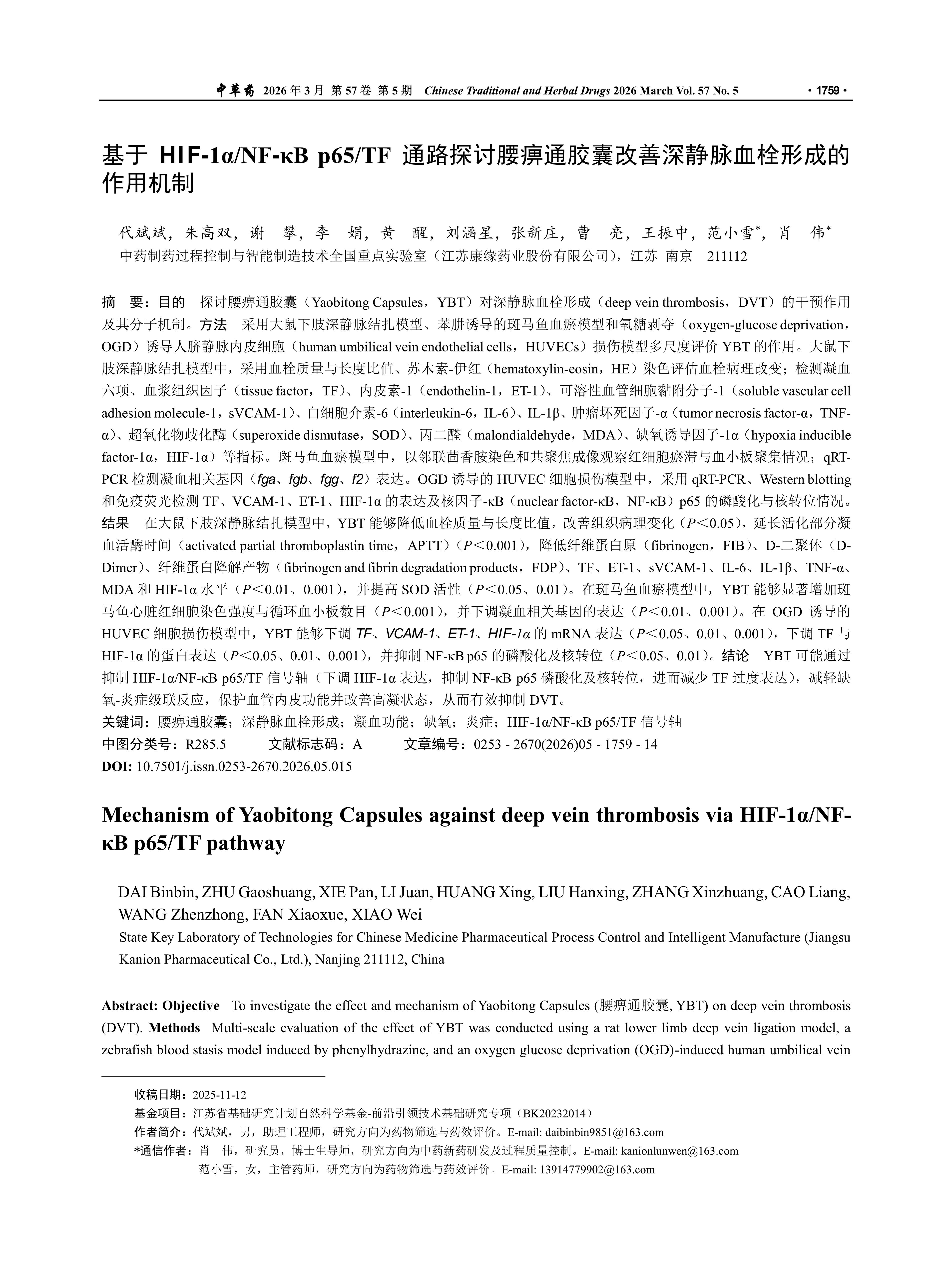 目的 探讨腰痹通胶囊(Yaobitong Capsules,YBT)对深静脉血栓形成(deep vein thrombosis,DVT)的干预作用及其分子机制。方法 采用大鼠下肢深静脉结扎模型、苯肼诱导的斑马鱼血瘀模型和氧糖剥夺(oxygen-glucose deprivation,OGD)诱导人脐静脉内皮细胞(human umbilical vein endothelial cells,HUVECs)损伤模型多尺度评价YBT的作用。大鼠下肢深静脉结扎模型中,采用血栓质量与长度比值、苏木素-伊红(hematoxylin-eosin,HE)染色评估血栓病理改变;检测凝血六项、血浆组织因子(tissue factor,TF)、内皮素-1(endothelin-1,ET-1)、可溶性血管细胞黏附分子-1(soluble vascular cell adhesion molecule-1,sVCAM-1)、白细胞介素-6(interleukin-6,IL-6)、IL-1β、肿瘤坏死因子-α(tumor necrosis factor-α,TNF-α)、超氧化物歧化酶(superoxide dismutase,SOD)、丙二醛(malondialdehyde,MDA)、缺氧诱导因子-1α(hypoxia inducible factor-1α,HIF-1α)等指标。斑马鱼血瘀模型中,以邻联茴香胺染色和共聚焦成像观察红细胞瘀滞与血小板聚集情况;qRT-PCR检测凝血相关基因(fga、fgb、fgg、f2)表达。OGD诱导的HUVEC细胞损伤模型中,采用qRT-PCR、Western blotting和免疫荧光检测TF、VCAM-1、ET-1、HIF-1α的表达及核因子-κB(nuclear factor-κB,NF-κB)p65的磷酸化与核转位情况。结果 在大鼠下肢深静脉结扎模型中,YBT能够降低血栓质量与长度比值,改善组织病理变化(P<0.05),延长活化部分凝血活酶时间(activated partial thromboplastin time,APTT)(P<0.001),降低纤维蛋白原(fibrinogen,FIB)、D-二聚体(D-Dimer)、纤维蛋白降解产物(fibrinogen and fibrin degradation products,FDP)、TF、ET-1、sVCAM-1、IL-6、IL-1β、TNF-α、MDA和HIF-1α水平(P<0.01、0.001),并提高SOD活性(P<0.05、0.01)。在斑马鱼血瘀模型中,YBT能够显著增加斑马鱼心脏红细胞染色强度与循环血小板数目(P<0.001),并下调凝血相关基因的表达(P<0.01、0.001)。在OGD诱导的HUVEC细胞损伤模型中,YBT能够下调TF、VCAM-1、ET-1、HIF-1α的mRNA表达(P<0.05、0.01、0.001),下调TF与HIF-1α的蛋白表达(P<0.05、0.01、0.001),并抑制NF-κB p65的磷酸化及核转位(P<0.05、0.01)。结论 YBT可能通过抑制HIF-1α/NF-κB p65/TF信号轴(下调HIF-1α表达,抑制NF-κB p65磷酸化及核转位,进而减少TF过度表达),减轻缺氧-炎症级联反应,保护血管内皮功能并改善高凝状态,从而有效抑制DVT。