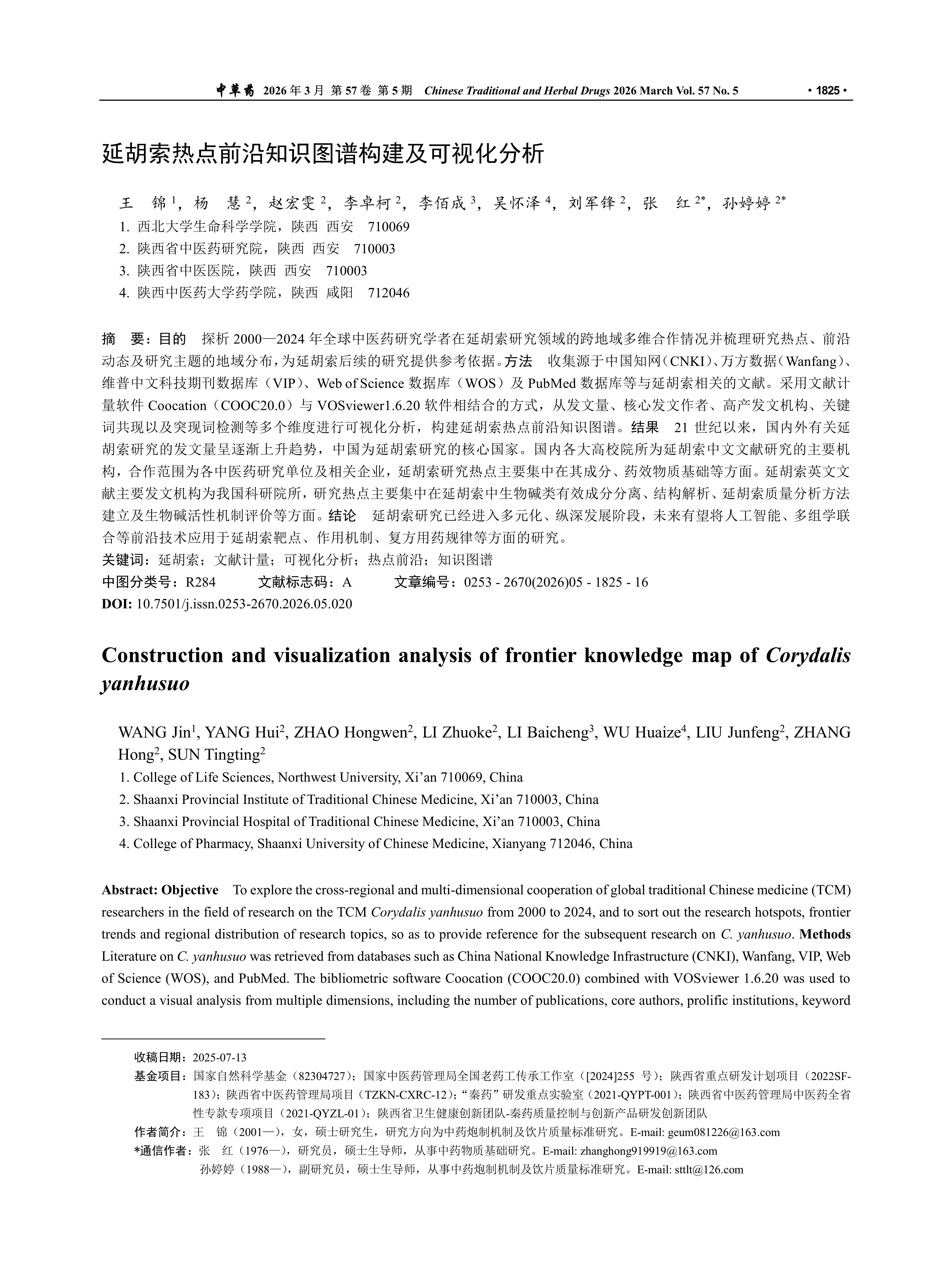 目的 探析2000—2024年全球中医药研究学者在延胡索研究领域的跨地域多维合作情况并梳理研究热点、前沿动态及研究主题的地域分布,为延胡索后续的研究提供参考依据。方法 收集源于中国知网(CNKI)、万方数据(Wanfang)、维普中文科技期刊数据库(VIP)、Web of Science数据库(WOS)及PubMed数据库等与延胡索相关的文献。采用文献计量软件Coocation(COOC20.0)与VOSviewer1.6.20软件相结合的方式,从发文量、核心发文作者、高产发文机构、关键词共现以及突现词检测等多个维度进行可视化分析,构建延胡索热点前沿知识图谱。结果 21世纪以来,国内外有关延胡索研究的发文量呈逐渐上升趋势,中国为延胡索研究的核心国家。国内各大高校院所为延胡索中文文献研究的主要机构,合作范围为各中医药研究单位及相关企业,延胡索研究热点主要集中在其成分、药效物质基础等方面。延胡索英文文献主要发文机构为我国科研院所,研究热点主要集中在延胡索中生物碱类有效成分分离、结构解析、延胡索质量分析方法建立及生物碱活性机制评价等方面。结论 延胡索研究已经进入多元化、纵深发展阶段,未来有望将人工智能、多组学联合等前沿技术应用于延胡索靶点、作用机制、复方用药规律等方面的研究。