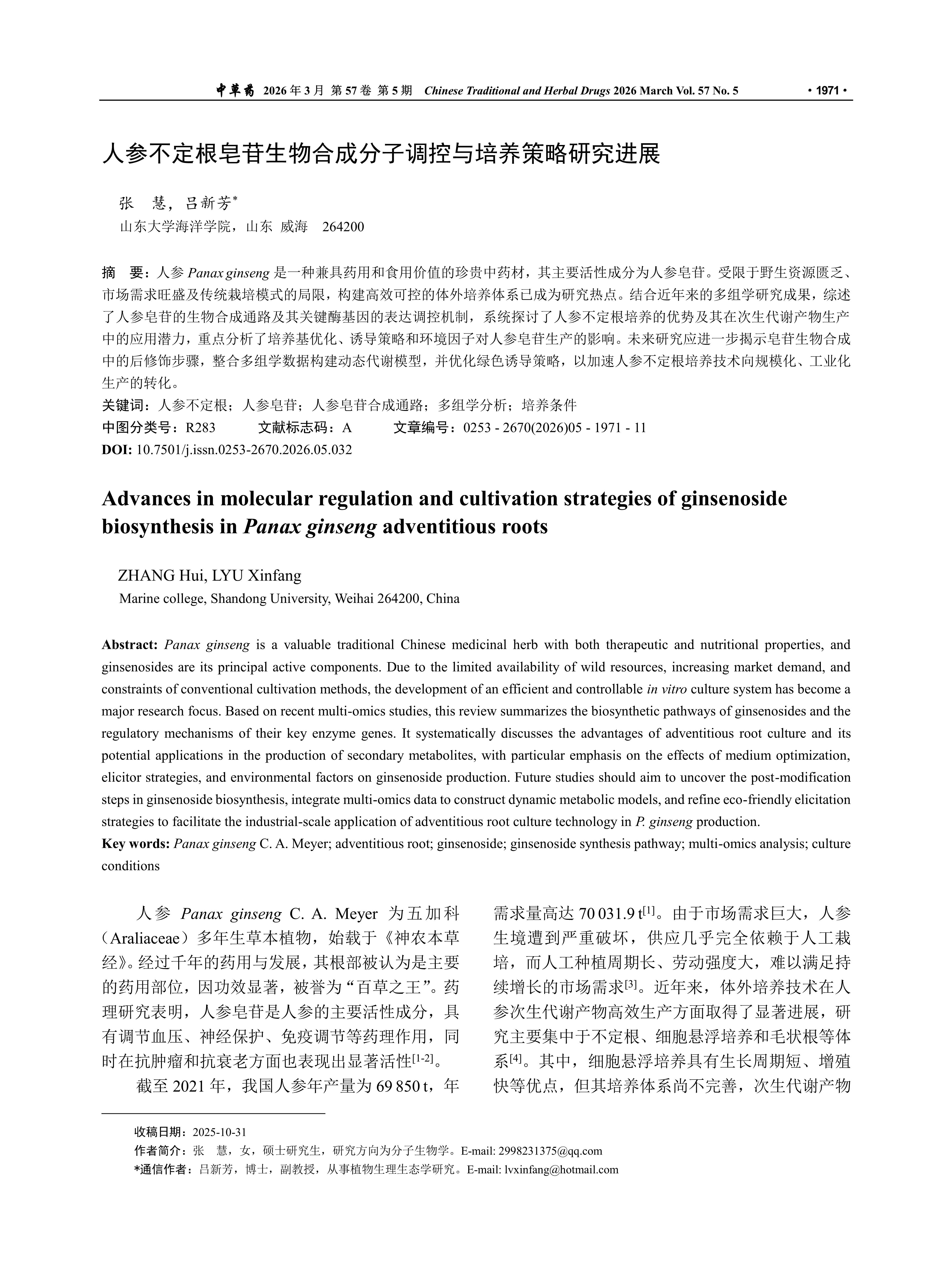 人参Panax ginseng是一种兼具药用和食用价值的珍贵中药材,其主要活性成分为人参皂苷。受限于野生资源匮乏、市场需求旺盛及传统栽培模式的局限,构建高效可控的体外培养体系已成为研究热点。结合近年来的多组学研究成果,综述了人参皂苷的生物合成通路及其关键酶基因的表达调控机制,系统探讨了人参不定根培养的优势及其在次生代谢产物生产中的应用潜力,重点分析了培养基优化、诱导策略和环境因子对人参皂苷生产的影响。未来研究应进一步揭示皂苷生物合成中的后修饰步骤,整合多组学数据构建动态代谢模型,并优化绿色诱导策略,以加速人参不定根培养技术向规模化、工业化生产的转化。