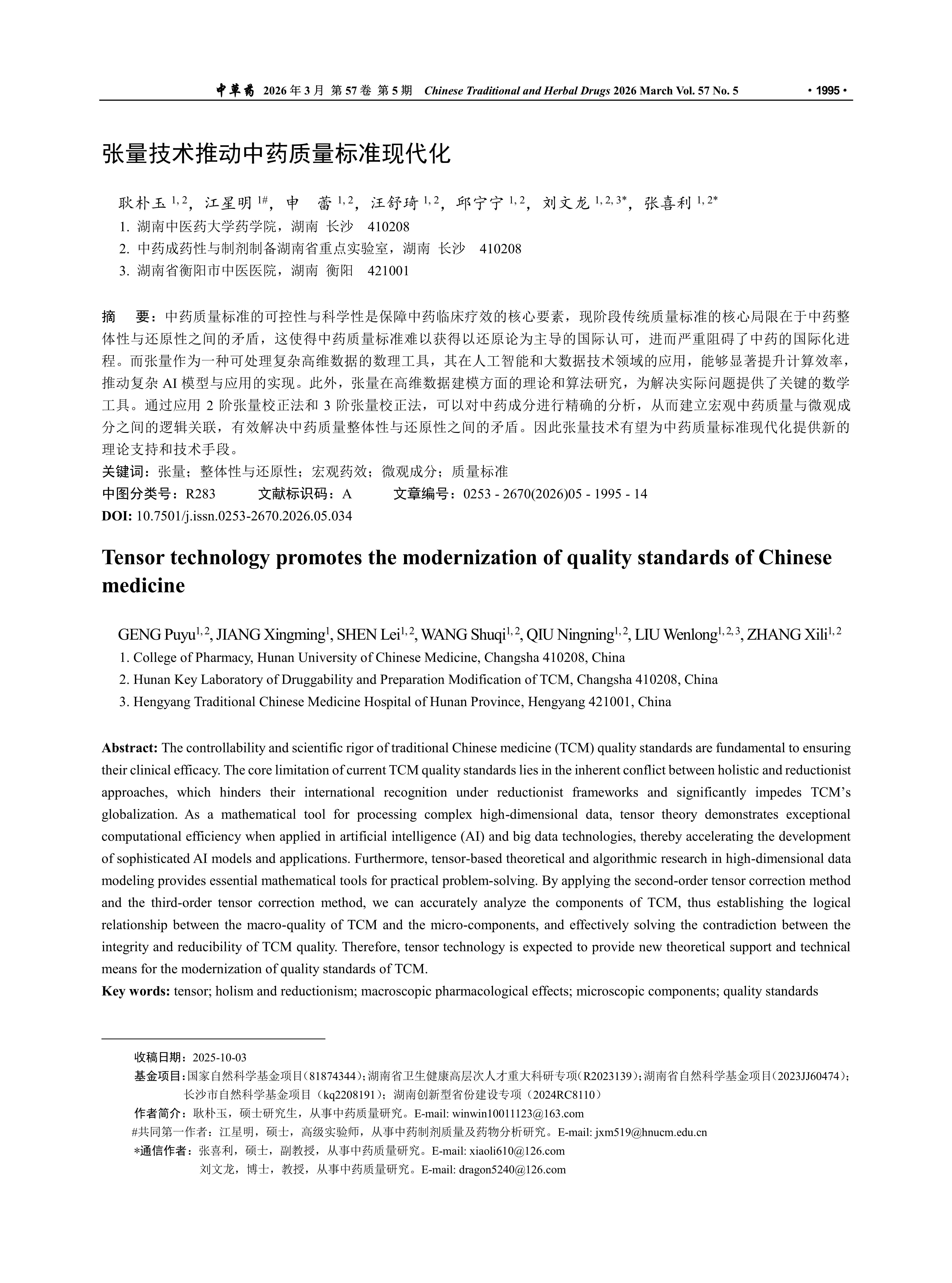 中药质量标准的可控性与科学性是保障中药临床疗效的核心要素,现阶段传统质量标准的核心局限在于中药整体性与还原性之间的矛盾,这使得中药质量标准难以获得以还原论为主导的国际认可,进而严重阻碍了中药的国际化进程。而张量作为一种可处理复杂高维数据的数理工具,其在人工智能和大数据技术领域的应用,能够显著提升计算效率,推动复杂AI模型与应用的实现。此外,张量在高维数据建模方面的理论和算法研究,为解决实际问题提供了关键的数学工具。通过应用2阶张量校正法和3阶张量校正法,可以对中药成分进行精确的分析,从而建立宏观中药质量与微观成分之间的逻辑关联,有效解决中药质量整体性与还原性之间的矛盾。因此张量技术有望为中药质量标准现代化提供新的理论支持和技术手段。