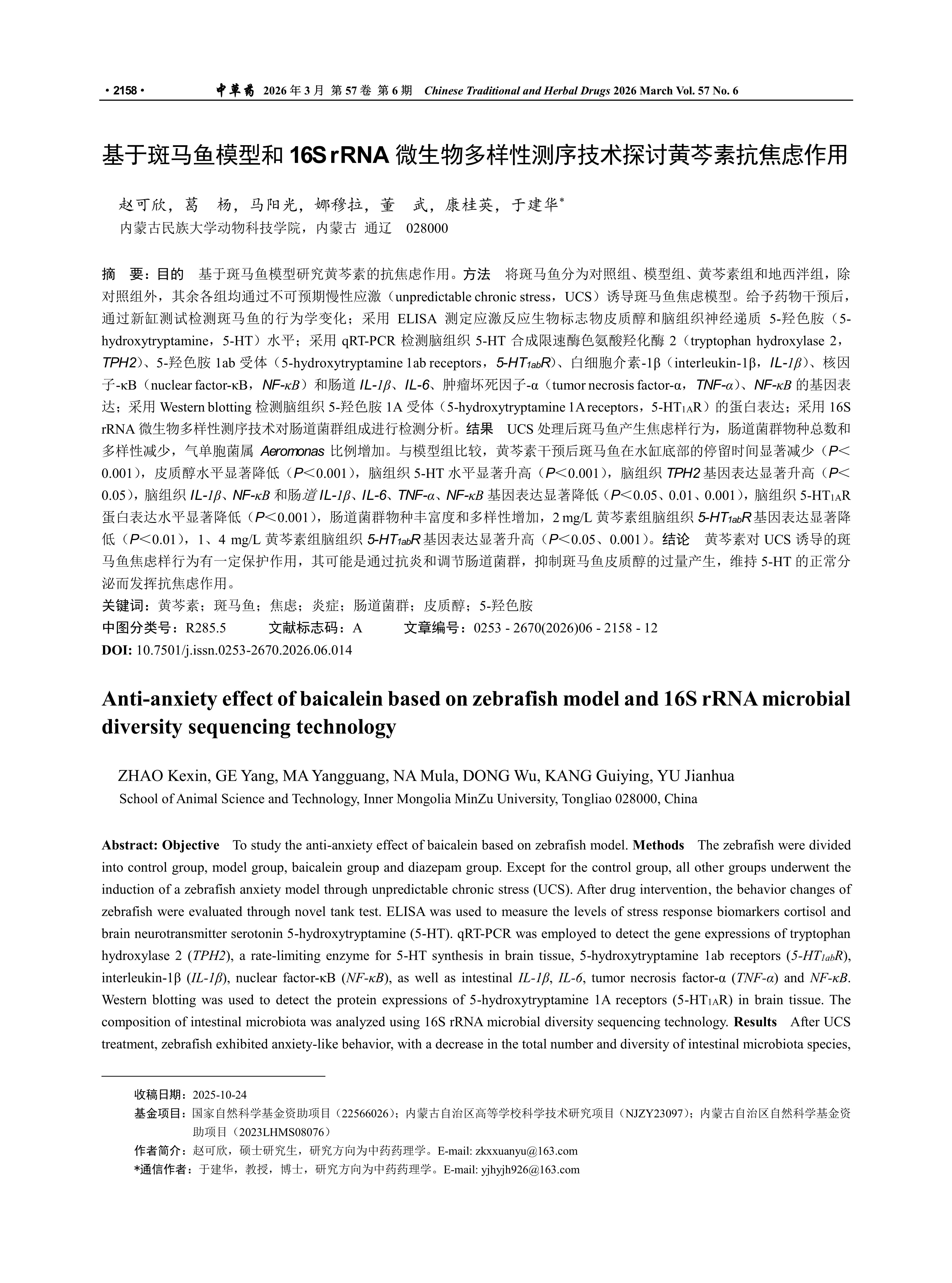 基于斑马鱼模型和16S rRNA微生物多样性测序技术探讨黄芩素抗焦虑作用