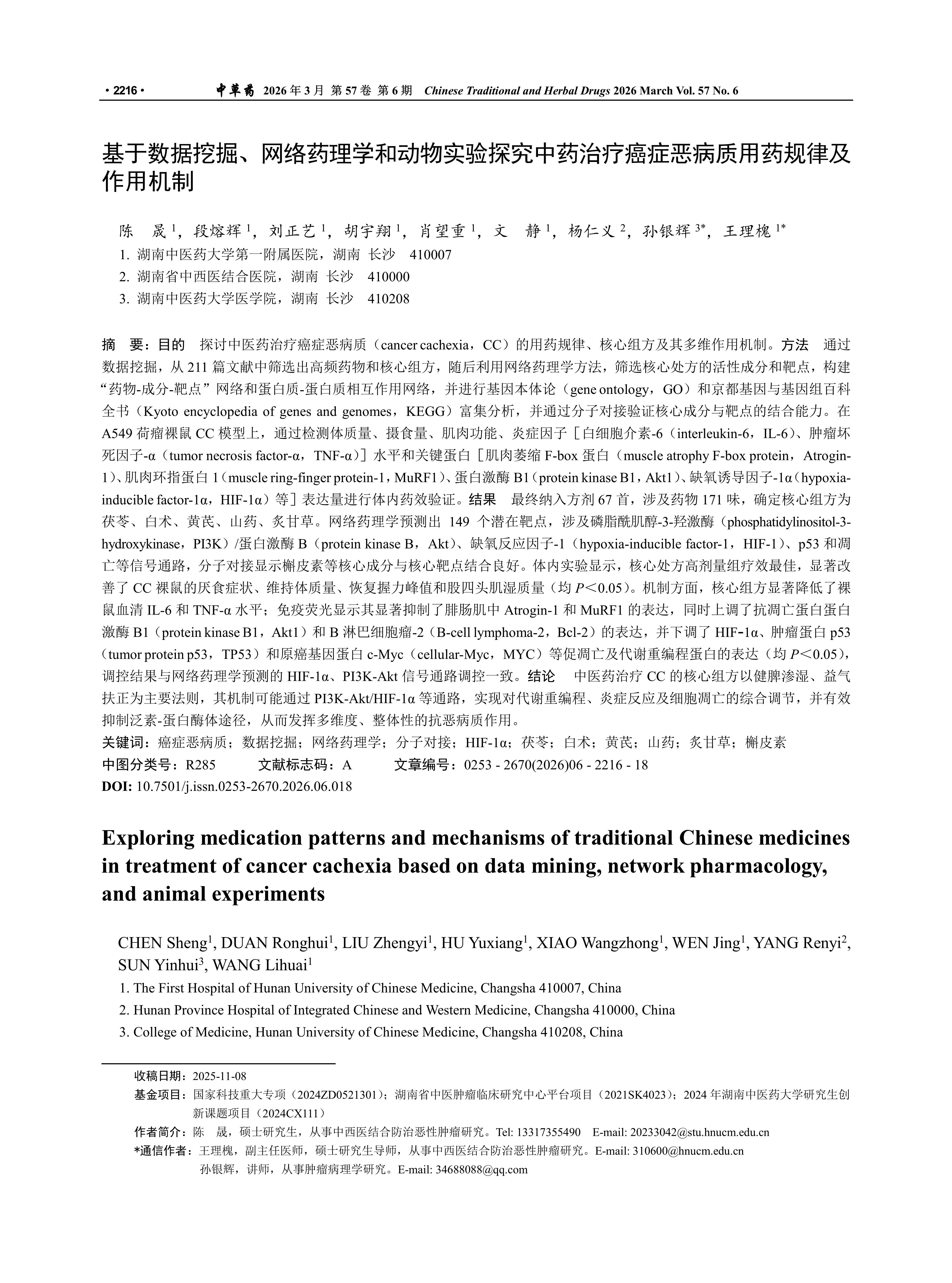 基于数据挖掘、网络药理学和动物实验探究中药治疗癌症恶病质用药规律及作用机制