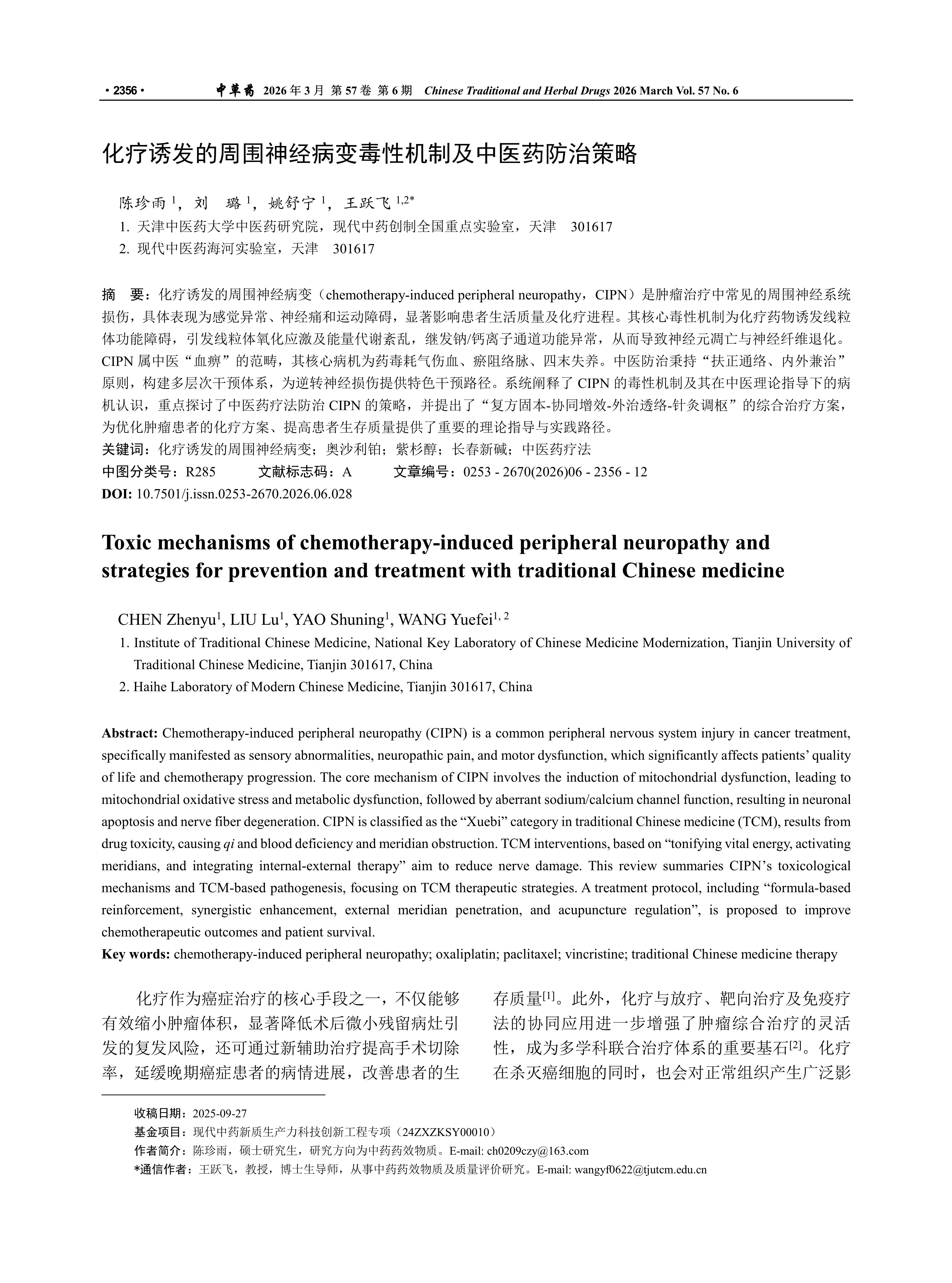 化疗诱发的周围神经病变(chemotherapy-induced peripheral neuropathy,CIPN)是肿瘤治疗中常见的周围神经系统损伤,具体表现为感觉异常、神经痛和运动障碍,显著影响患者生活质量及化疗进程。其核心毒性机制为化疗药物诱发线粒体功能障碍,引发线粒体氧化应激及能量代谢紊乱,继发钠/钙离子通道功能异常,从而导致神经元凋亡与神经纤维退化。CIPN属中医“血痹”的范畴,其核心病机为药毒耗气伤血、瘀阻络脉、四末失养。中医防治秉持“扶正通络、内外兼治”原则,构建多层次干预体系,为逆转神经损伤提供特色干预路径。系统阐释了CIPN的毒性机制及其在中医理论指导下的病机认识,重点探讨了中医药疗法防治CIPN的策略,并提出了“复方固本-协同增效-外治透络-针灸调枢”的综合治疗方案,为优化肿瘤患者的化疗方案、提高患者生存质量提供了重要的理论指导与实践路径。