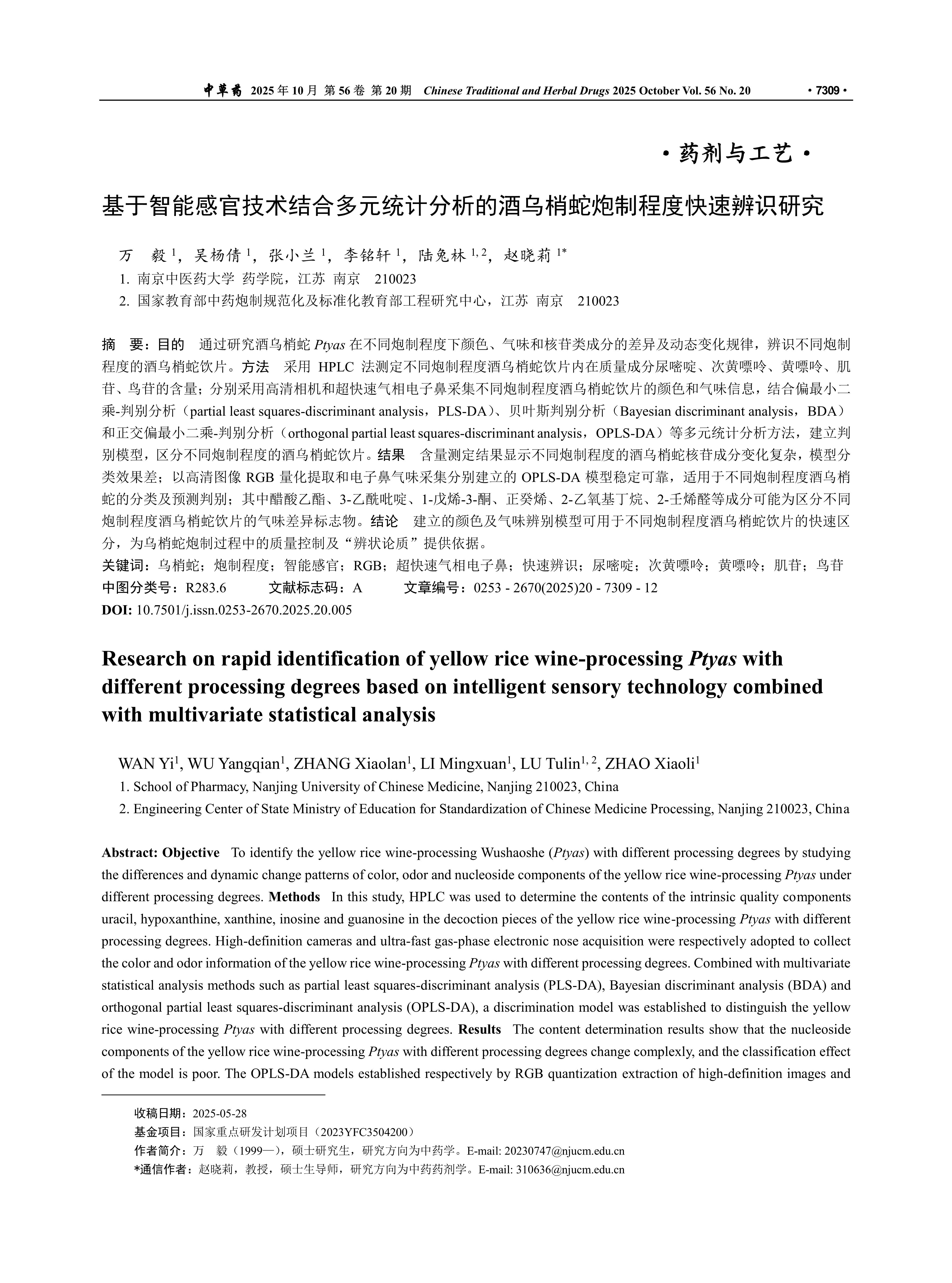 目的 通过研究酒乌梢蛇Ptyas在不同炮制程度下颜色、气味和核苷类成分的差异及动态变化规律,辨识不同炮制程度的酒乌梢蛇饮片。方法 采用HPLC法测定不同炮制程度酒乌梢蛇饮片内在质量成分尿嘧啶、次黄嘌呤、黄嘌呤、肌苷、鸟苷的含量;分别采用高清相机和超快速气相电子鼻采集不同炮制程度酒乌梢蛇饮片的颜色和气味信息,结合偏最小二乘-判别分析(partial least squares-discriminant analysis,PLS-DA)、贝叶斯判别分析(Bayesian discriminant analysis,BDA)和正交偏最小二乘-判别分析(orthogonal partial least squares-discriminant analysis,OPLS-DA)等多元统计分析方法,建立判别模型,区分不同炮制程度的酒乌梢蛇饮片。结果 含量测定结果显示不同炮制程度的酒乌梢蛇核苷成分变化复杂,模型分类效果差;以高清图像RGB量化提取和电子鼻气味采集分别建立的OPLS-DA模型稳定可靠,适用于不同炮制程度酒乌梢蛇的分类及预测判别;其中醋酸乙酯、3-乙酰吡啶、1-戊烯-3-酮、正癸烯、2-乙氧基丁烷、2-壬烯醛等成分可能为区分不同炮制程度酒乌梢蛇饮片的气味差异标志物。结论 建立的颜色及气味辨别模型可用于不同炮制程度酒乌梢蛇饮片的快速区分,为乌梢蛇炮制过程中的质量控制及“辨状论质”提供依据。