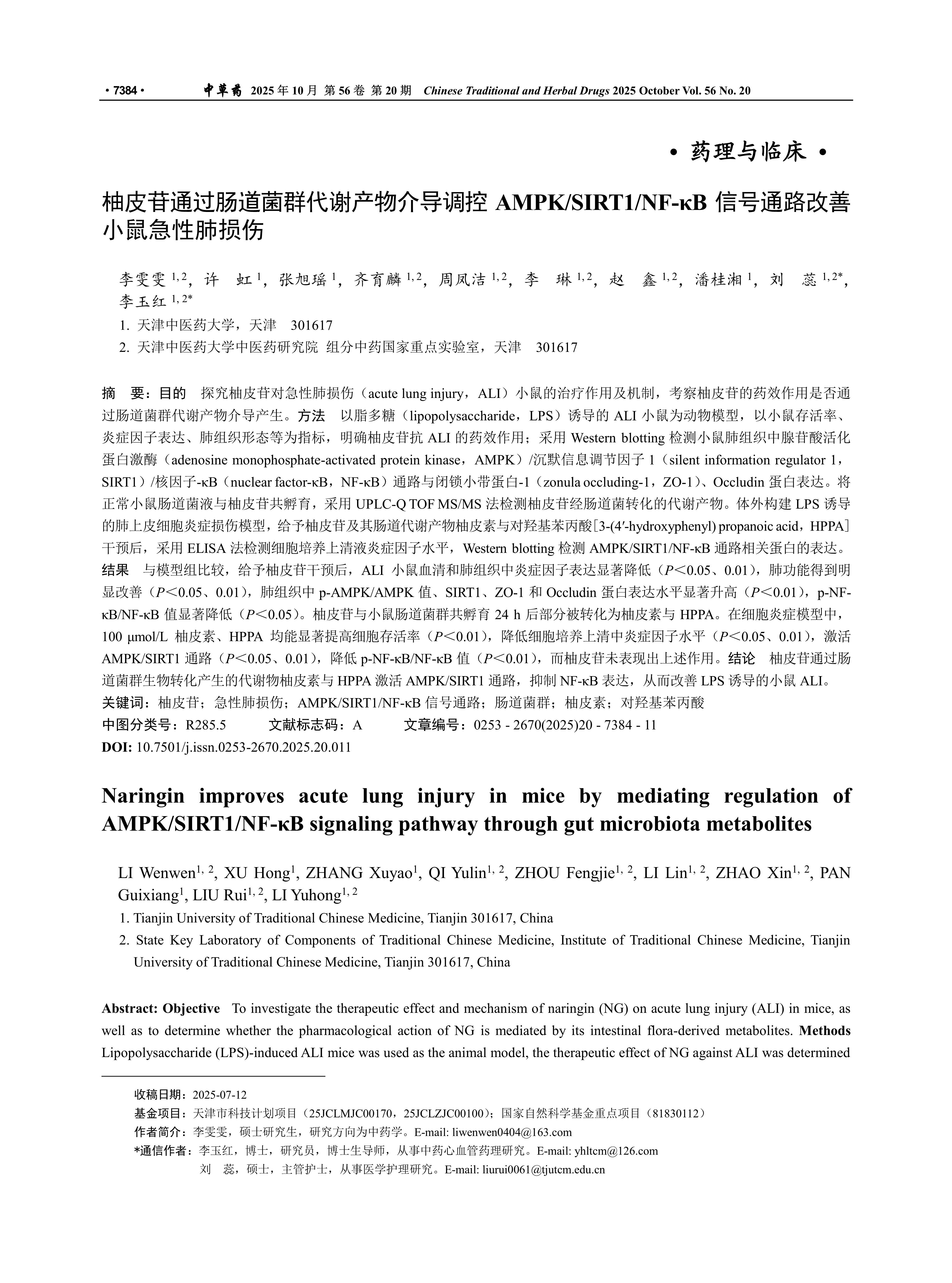 目的 探究柚皮苷对急性肺损伤(acute lung injury,ALI)小鼠的治疗作用及机制,考察柚皮苷的药效作用是否通过肠道菌群代谢产物介导产生。方法 以脂多糖(lipopolysaccharide,LPS)诱导的ALI小鼠为动物模型,以小鼠存活率、炎症因子表达、肺组织形态等为指标,明确柚皮苷抗ALI的药效作用;采用Western blotting检测小鼠肺组织中腺苷酸活化蛋白激酶(adenosine monophosphate-activated protein kinase,AMPK)/沉默信息调节因子1(silent information regulator 1,SIRT1)/核因子-κB(nuclear factor-κB,NF-κB)通路与闭锁小带蛋白-1(zonula occluding-1,ZO-1)、Occludin蛋白表达。将正常小鼠肠道菌液与柚皮苷共孵育,采用UPLC-Q TOF MS/MS法检测柚皮苷经肠道菌转化的代谢产物。体外构建LPS诱导的肺上皮细胞炎症损伤模型,给予柚皮苷及其肠道代谢产物柚皮素与对羟基苯丙酸[3-(4′-hydroxyphenyl) propanoic acid,HPPA]干预后,采用ELISA法检测细胞培养上清液炎症因子水平,Western blotting检测AMPK/SIRT1/NF-κB通路相关蛋白的表达。结果 与模型组比较,给予柚皮苷干预后,ALI小鼠血清和肺组织中炎症因子表达显著降低(P<0.05、0.01),肺功能得到明显改善(P<0.05、0.01),肺组织中p-AMPK/AMPK值、SIRT1、ZO-1和Occludin蛋白表达水平显著升高(P<0.01),p-NF-κB/NF-κB值显著降低(P<0.05)。柚皮苷与小鼠肠道菌群共孵育24 h后部分被转化为柚皮素与HPPA。在细胞炎症模型中,100 μmol/L柚皮素、HPPA均能显著提高细胞存活率(P<0.01),降低细胞培养上清中炎症因子水平(P<0.05、0.01),激活AMPK/SIRT1通路(P<0.05、0.01),降低p-NF-κB/NF-κB值(P<0.01),而柚皮苷未表现出上述作用。结论 柚皮苷通过肠道菌群生物转化产生的代谢物柚皮素与HPPA激活AMPK/SIRT1通路,抑制NF-κB表达,从而改善LPS诱导的小鼠ALI。