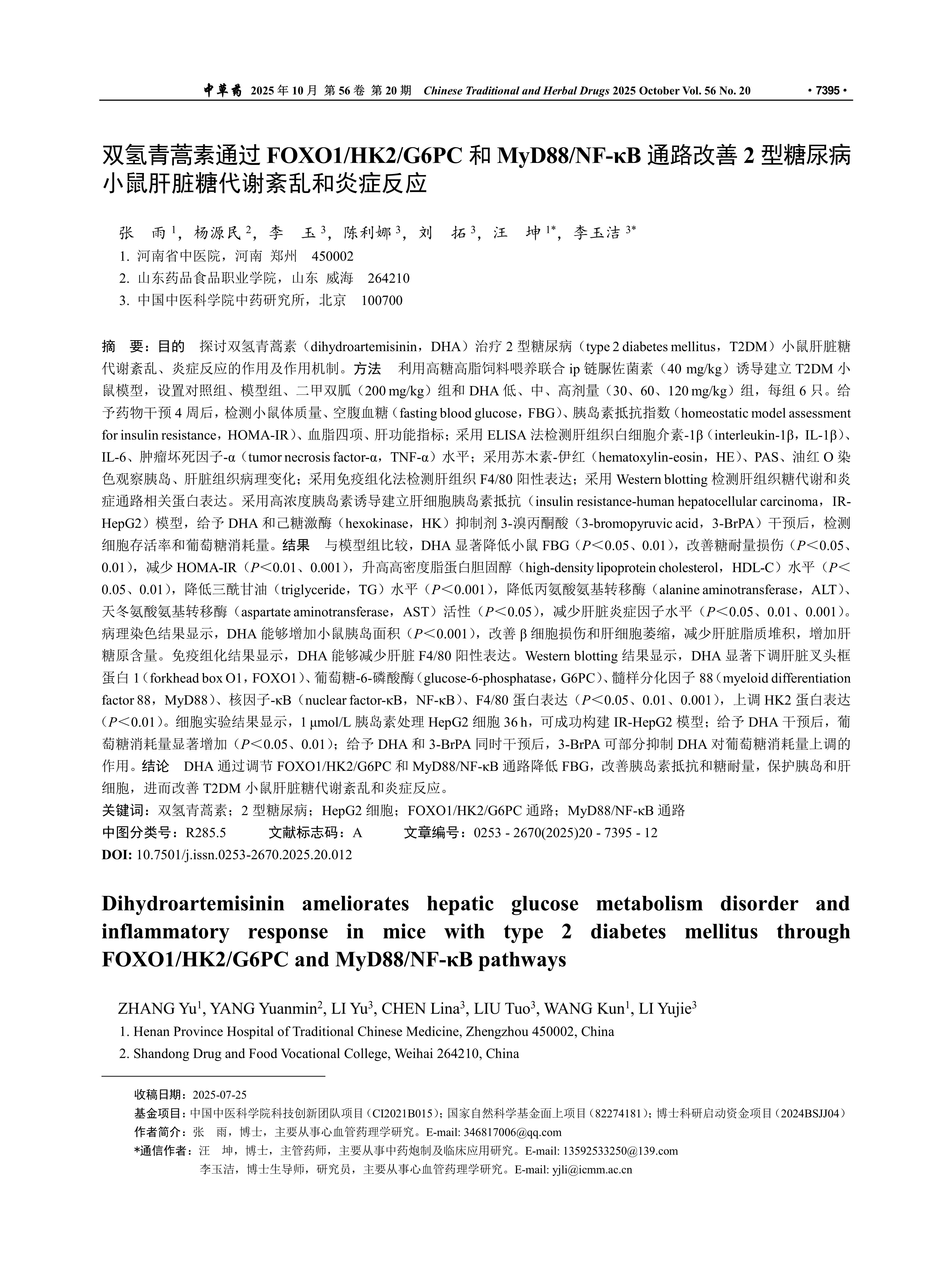 目的 探讨双氢青蒿素(dihydroartemisinin,DHA)治疗2型糖尿病(type 2 diabetes mellitus,T2DM)小鼠肝脏糖代谢紊乱、炎症反应的作用及作用机制。方法 利用高糖高脂饲料喂养联合ip链脲佐菌素(40 mg/kg)诱导建立T2DM小鼠模型,设置对照组、模型组、二甲双胍(200 mg/kg)组和DHA低、中、高剂量(30、60、120 mg/kg)组,每组6只。给予药物干预4周后,检测小鼠体质量、空腹血糖(fasting blood glucose,FBG)、胰岛素抵抗指数(homeostatic model assessment for insulin resistance,HOMA-IR)、血脂四项、肝功能指标;采用ELISA法检测肝组织白细胞介素-1β(interleukin-1β,IL-1β)、IL-6、肿瘤坏死因子-α(tumor necrosis factor-α,TNF-α)水平;采用苏木素-伊红(hematoxylin-eosin,HE)、PAS、油红O染色观察胰岛、肝脏组织病理变化;采用免疫组化法检测肝组织F4/80阳性表达;采用Western blotting检测肝组织糖代谢和炎症通路相关蛋白表达。采用高浓度胰岛素诱导建立肝细胞胰岛素抵抗(insulin resistance-human hepatocellular carcinoma,IR-HepG2)模型,给予DHA和己糖激酶(hexokinase,HK)抑制剂3-溴丙酮酸(3-bromopyruvic acid,3-BrPA)干预后,检测细胞存活率和葡萄糖消耗量。结果 与模型组比较,DHA显著降低小鼠FBG(P<0.05、0.01),改善糖耐量损伤(P<0.05、0.01),减少HOMA-IR(P<0.01、0.001),升高高密度脂蛋白胆固醇(high-density lipoprotein cholesterol,HDL-C)水平(P<0.05、0.01),降低三酰甘油(triglyceride,TG)水平(P<0.001),降低丙氨酸氨基转移酶(alanine aminotransferase,ALT)、天冬氨酸氨基转移酶(aspartate aminotransferase,AST)活性(P<0.05),减少肝脏炎症因子水平(P<0.05、0.01、0.001)。病理染色结果显示,DHA能够增加小鼠胰岛面积(P<0.001),改善β细胞损伤和肝细胞萎缩,减少肝脏脂质堆积,增加肝糖原含量。免疫组化结果显示,DHA能够减少肝脏F4/80阳性表达。Western blotting结果显示,DHA显著下调肝脏叉头框蛋白1(forkhead box O1,FOXO1)、葡萄糖-6-磷酸酶(glucose-6-phosphatase,G6PC)、髓样分化因子88(myeloid differentiation factor 88,MyD88)、核因子-κB(nuclear factor-κB,NF-κB)、F4/80蛋白表达(P<0.05、0.01、0.001),上调HK2蛋白表达(P<0.01)。细胞实验结果显示,1 μmol/L胰岛素处理HepG2细胞36 h,可成功构建IR-HepG2模型;给予DHA干预后,葡萄糖消耗量显著增加(P<0.05、0.01);给予DHA和3-BrPA同时干预后,3-BrPA可部分抑制DHA对葡萄糖消耗量上调的作用。结论 DHA通过调节FOXO1/HK2/G6PC和MyD88/NF-κB通路降低FBG,改善胰岛素抵抗和糖耐量,保护胰岛和肝细胞,进而改善T2DM小鼠肝脏糖代谢紊乱和炎症反应。