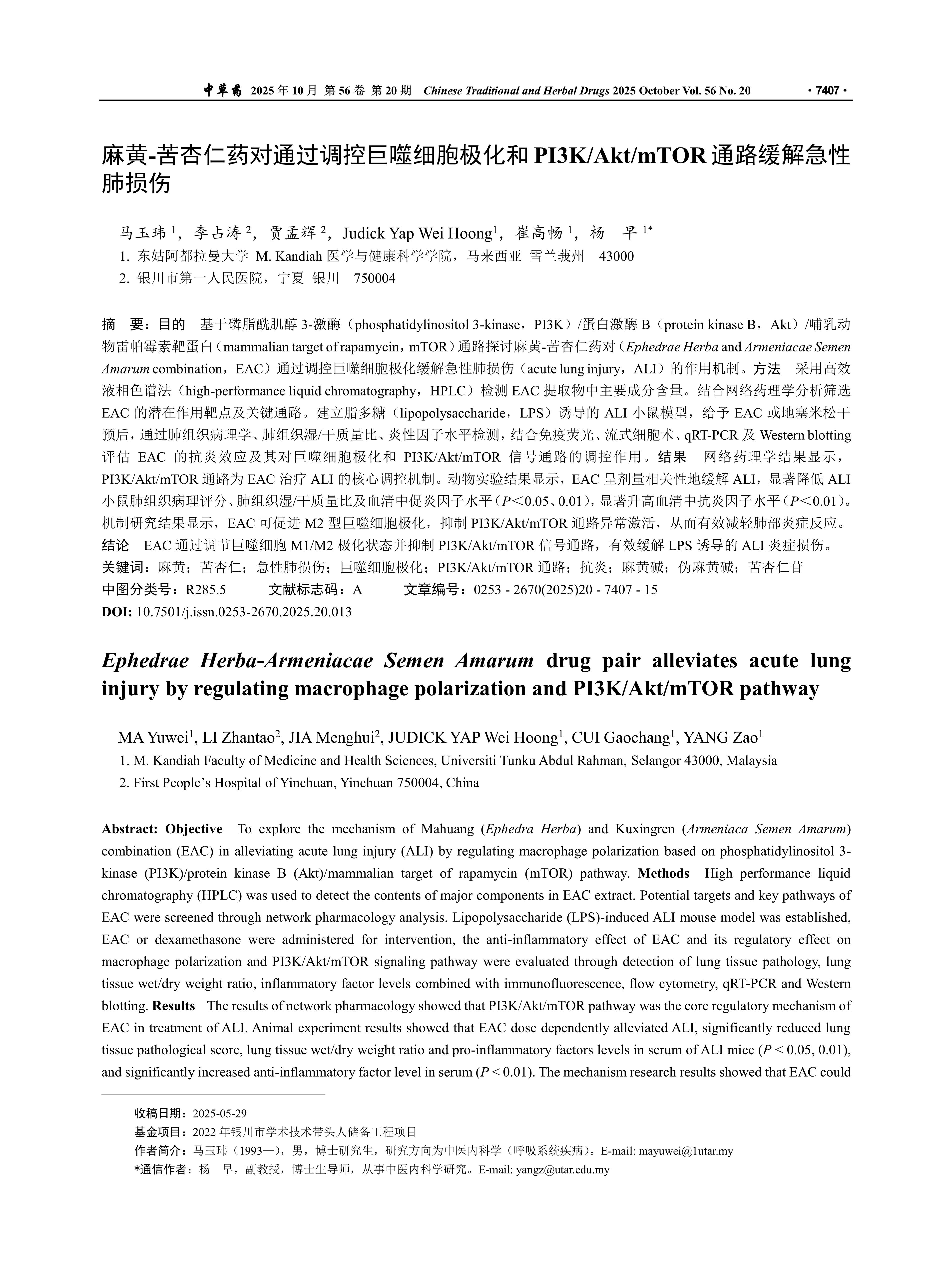 目的 基于磷脂酰肌醇3-激酶(phosphatidylinositol 3-kinase,PI3K)/蛋白激酶B(protein kinase B,Akt)/哺乳动物雷帕霉素靶蛋白(mammalian target of rapamycin,mTOR)通路探讨麻黄-苦杏仁药对(Ephedrae Herba and Armeniacae Semen Amarum combination,EAC)通过调控巨噬细胞极化缓解急性肺损伤(acute lung injury,ALI)的作用机制。方法 采用高效液相色谱法(high-performance liquid chromatography,HPLC)检测EAC提取物中主要成分含量。结合网络药理学分析筛选EAC的潜在作用靶点及关键通路。建立脂多糖(lipopolysaccharide,LPS)诱导的ALI小鼠模型,给予EAC或地塞米松干预后,通过肺组织病理学、肺组织湿/干质量比、炎性因子水平检测,结合免疫荧光、流式细胞术、qRT-PCR及Western blotting评估EAC的抗炎效应及其对巨噬细胞极化和PI3K/Akt/mTOR信号通路的调控作用。结果 网络药理学结果显示,PI3K/Akt/mTOR通路为EAC治疗ALI的核心调控机制。动物实验结果显示,EAC呈剂量相关性地缓解ALI,显著降低ALI小鼠肺组织病理评分、肺组织湿/干质量比及血清中促炎因子水平(P<0.05、0.01),显著升高血清中抗炎因子水平(P<0.01)。机制研究结果显示,EAC可促进M2型巨噬细胞极化,抑制PI3K/Akt/mTOR通路异常激活,从而有效减轻肺部炎症反应。结论 EAC通过调节巨噬细胞M1/M2极化状态并抑制PI3K/Akt/mTOR信号通路,有效缓解LPS诱导的ALI炎症损伤。