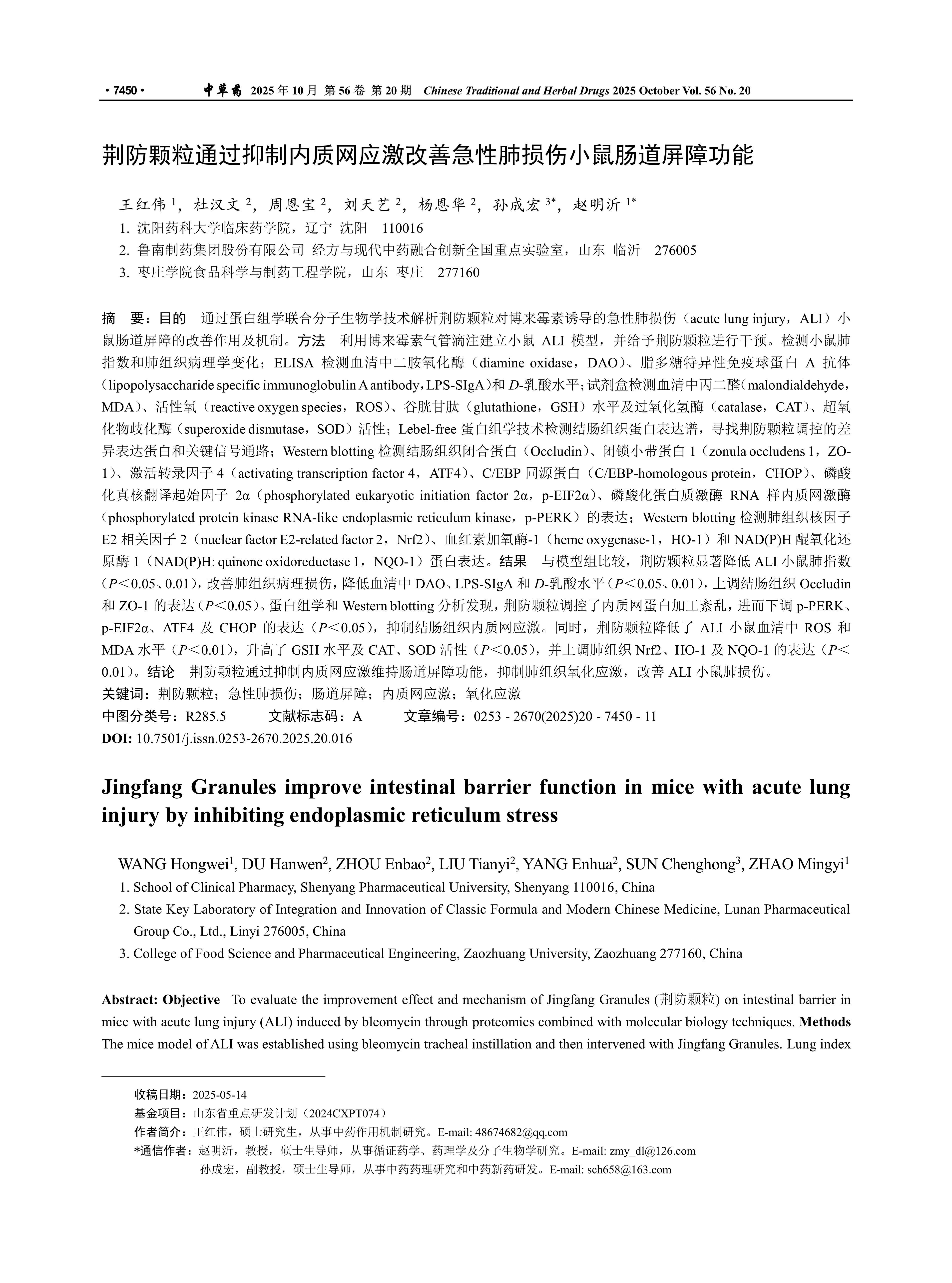 目的 通过蛋白组学联合分子生物学技术解析荆防颗粒对博来霉素诱导的急性肺损伤(acute lung injury,ALI)小鼠肠道屏障的改善作用及机制。方法 利用博来霉素气管滴注建立小鼠ALI模型,并给予荆防颗粒进行干预。检测小鼠肺指数和肺组织病理学变化;ELISA检测血清中二胺氧化酶(diamine oxidase,DAO)、脂多糖特异性免疫球蛋白A抗体(lipopolysaccharide specific immunoglobulin A antibody,LPS-SIgA)和D-乳酸水平;试剂盒检测血清中丙二醛(malondialdehyde,MDA)、活性氧(reactive oxygen species,ROS)、谷胱甘肽(glutathione,GSH)水平及过氧化氢酶(catalase,CAT)、超氧化物歧化酶(superoxide dismutase,SOD)活性;Lebel-free蛋白组学技术检测结肠组织蛋白表达谱,寻找荆防颗粒调控的差异表达蛋白和关键信号通路;Western blotting检测结肠组织闭合蛋白(Occludin)、闭锁小带蛋白1 (zonula occludens 1,ZO-1)、激活转录因子4(activating transcription factor 4,ATF4)、C/EBP同源蛋白(C/EBP-homologous protein,CHOP)、磷酸化真核翻译起始因子2α(phosphorylated eukaryotic initiation factor 2α,p-EIF2α)、磷酸化蛋白质激酶RNA样内质网激酶(phosphorylated protein kinase RNA-like endoplasmic reticulum kinase,p-PERK)的表达;Western blotting检测肺组织核因子E2相关因子2(nuclear factor E2-related factor 2,Nrf2)、血红素加氧酶-1(heme oxygenase-1,HO-1)和NAD(P)H醌氧化还原酶1(NAD(P)H: quinone oxidoreductase 1,NQO-1)蛋白表达。结果 与模型组比较,荆防颗粒显著降低ALI小鼠肺指数(P<0.05、0.01),改善肺组织病理损伤,降低血清中DAO、LPS-SIgA和D-乳酸水平(P<0.05、0.01),上调结肠组织Occludin和ZO-1的表达(P<0.05)。蛋白组学和Western blotting分析发现,荆防颗粒调控了内质网蛋白加工紊乱,进而下调p-PERK、p-EIF2α、ATF4及CHOP的表达(P<0.05),抑制结肠组织内质网应激。同时,荆防颗粒降低了ALI小鼠血清中ROS和MDA水平(P<0.01),升高了GSH水平及CAT、SOD活性(P<0.05),并上调肺组织Nrf2、HO-1及NQO-1的表达(P<0.01)。结论 荆防颗粒通过抑制内质网应激维持肠道屏障功能,抑制肺组织氧化应激,改善ALI小鼠肺损伤。