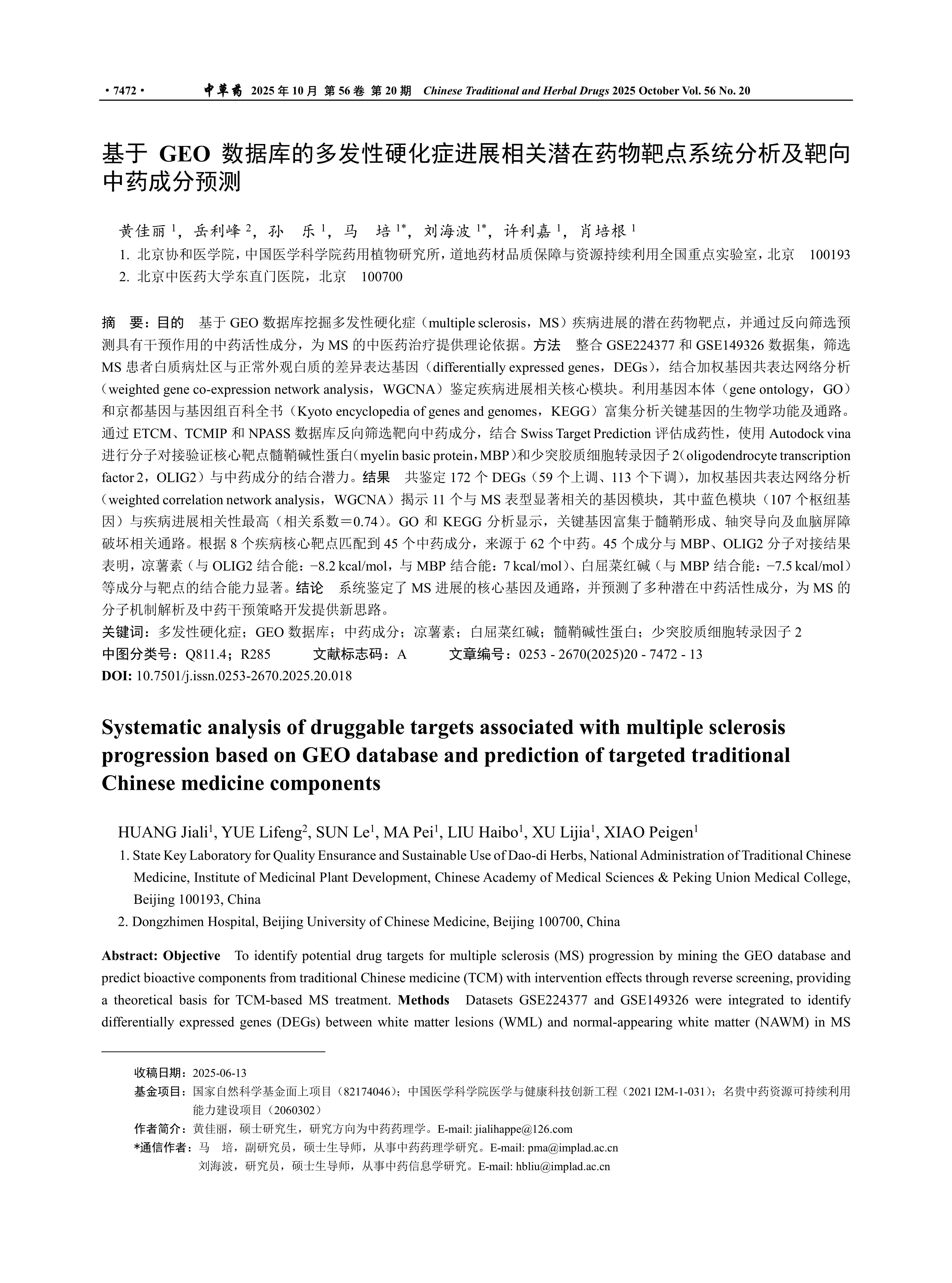 目的 基于GEO数据库挖掘多发性硬化症(multiple sclerosis,MS)疾病进展的潜在药物靶点,并通过反向筛选预测具有干预作用的中药活性成分,为MS的中医药治疗提供理论依据。方法 整合GSE224377和GSE149326数据集,筛选MS患者白质病灶区与正常外观白质的差异表达基因(differentially expressed genes,DEGs),结合加权基因共表达网络分析(weighted gene co-expression network analysis,WGCNA)鉴定疾病进展相关核心模块。利用基因本体(gene ontology,GO)和京都基因与基因组百科全书(Kyoto encyclopedia of genes and genomes,KEGG)富集分析关键基因的生物学功能及通路。通过ETCM、TCMIP和NPASS数据库反向筛选靶向中药成分,结合Swiss Target Prediction评估成药性,使用Autodock vina进行分子对接验证核心靶点髓鞘碱性蛋白(myelin basic protein,MBP)和少突胶质细胞转录因子2(oligodendrocyte transcription factor 2,OLIG2)与中药成分的结合潜力。结果 共鉴定172个DEGs(59个上调、113个下调),加权基因共表达网络分析(weighted correlation network analysis,WGCNA)揭示11个与MS表型显著相关的基因模块,其中蓝色模块(107个枢纽基因)与疾病进展相关性最高(相关系数=0.74)。GO和KEGG分析显示,关键基因富集于髓鞘形成、轴突导向及血脑屏障破坏相关通路。根据8个疾病核心靶点匹配到45个中药成分,来源于62个中药。45个成分与MBP、OLIG2分子对接结果表明,凉薯素(与OLIG2结合能:-8.2 kcal/mol,与MBP结合能:7 kcal/mol)、白屈菜红碱(与MBP结合能:-7.5 kcal/mol)等成分与靶点的结合能力显著。结论 系统鉴定了MS进展的核心基因及通路,并预测了多种潜在中药活性成分,为MS的分子机制解析及中药干预策略开发提供新思路。