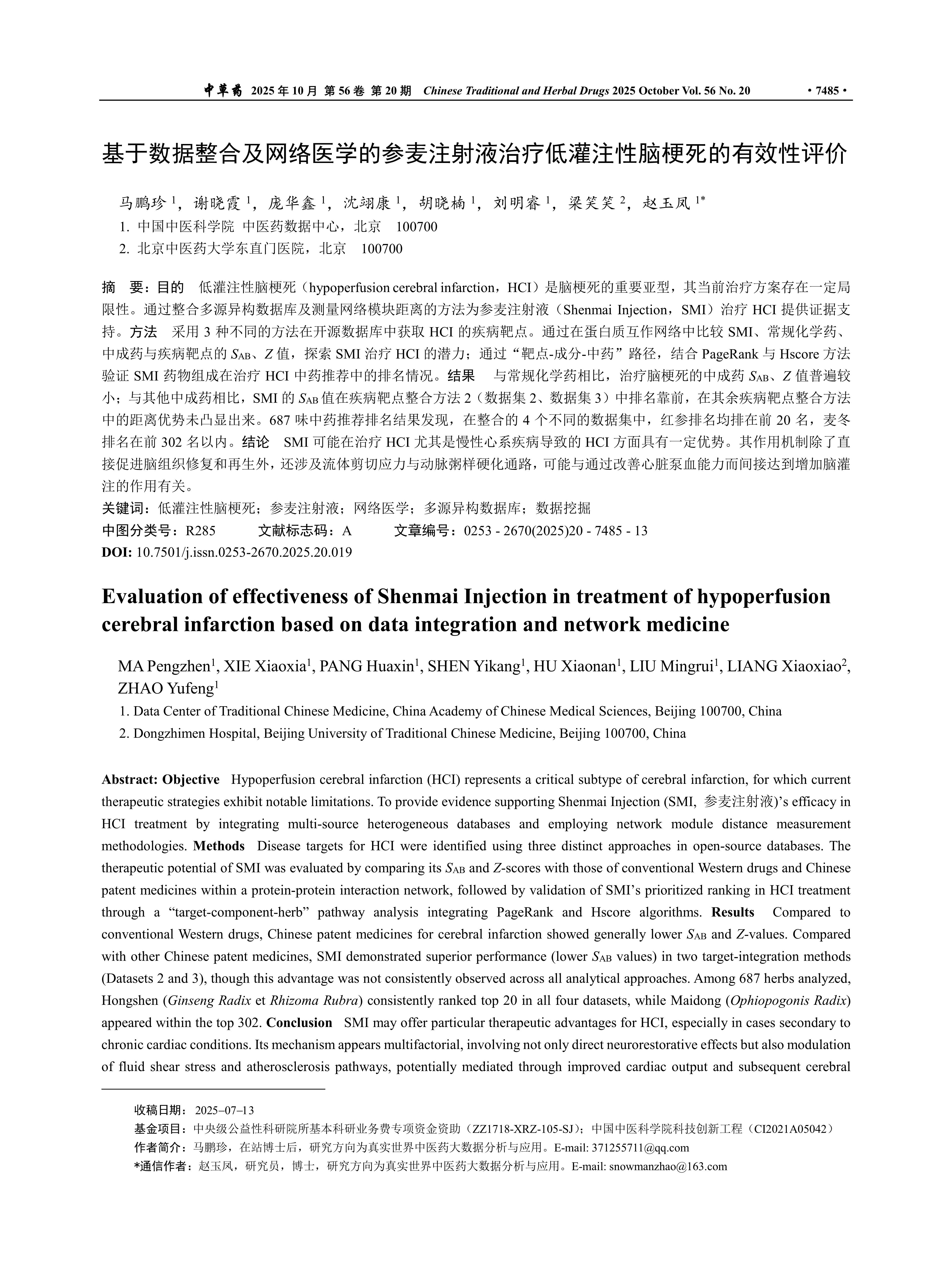 Objective Hypoperfusion cerebral infarction (HCI) represents a critical subtype of cerebral infarction, for which current therapeutic strategies exhibit notable limitations. To provide evidence supporting Shenmai Injection (SMI, 参麦注射液)’s efficacy in HCI treatment by integrating multi-source heterogeneous databases and employing network module distance measurement methodologies. Methods Disease targets for HCI were identified using three distinct approaches in open-source databases. The therapeutic potential of SMI was evaluated by comparing its SAB and Z-scores with those of conventional Western drugs and Chinese patent medicines within a protein-protein interaction network, followed by validation of SMI’s prioritized ranking in HCI treatment through a “target-component-herb” pathway analysis integrating PageRank and Hscore algorithms. Results Compared to conventional Western drugs, Chinese patent medicines for cerebral infarction showed generally lower SAB and Z-values. Compared with other Chinese patent medicines, SMI demonstrated superior performance (lower SAB values) in two target-integration methods (Datasets 2 and 3), though this advantage was not consistently observed across all analytical approaches. Among 687 herbs analyzed, Hongshen (Ginseng Radix et Rhizoma Rubra) consistently ranked top 20 in all four datasets, while Maidong (Ophiopogonis Radix) appeared within the top 302. Conclusion SMI may offer particular therapeutic advantages for HCI, especially in cases secondary to chronic cardiac conditions. Its mechanism appears multifactorial, involving not only direct neurorestorative effects but also modulation of fluid shear stress and atherosclerosis pathways, potentially mediated through improved cardiac output and subsequent cerebral perfusion enhancement.