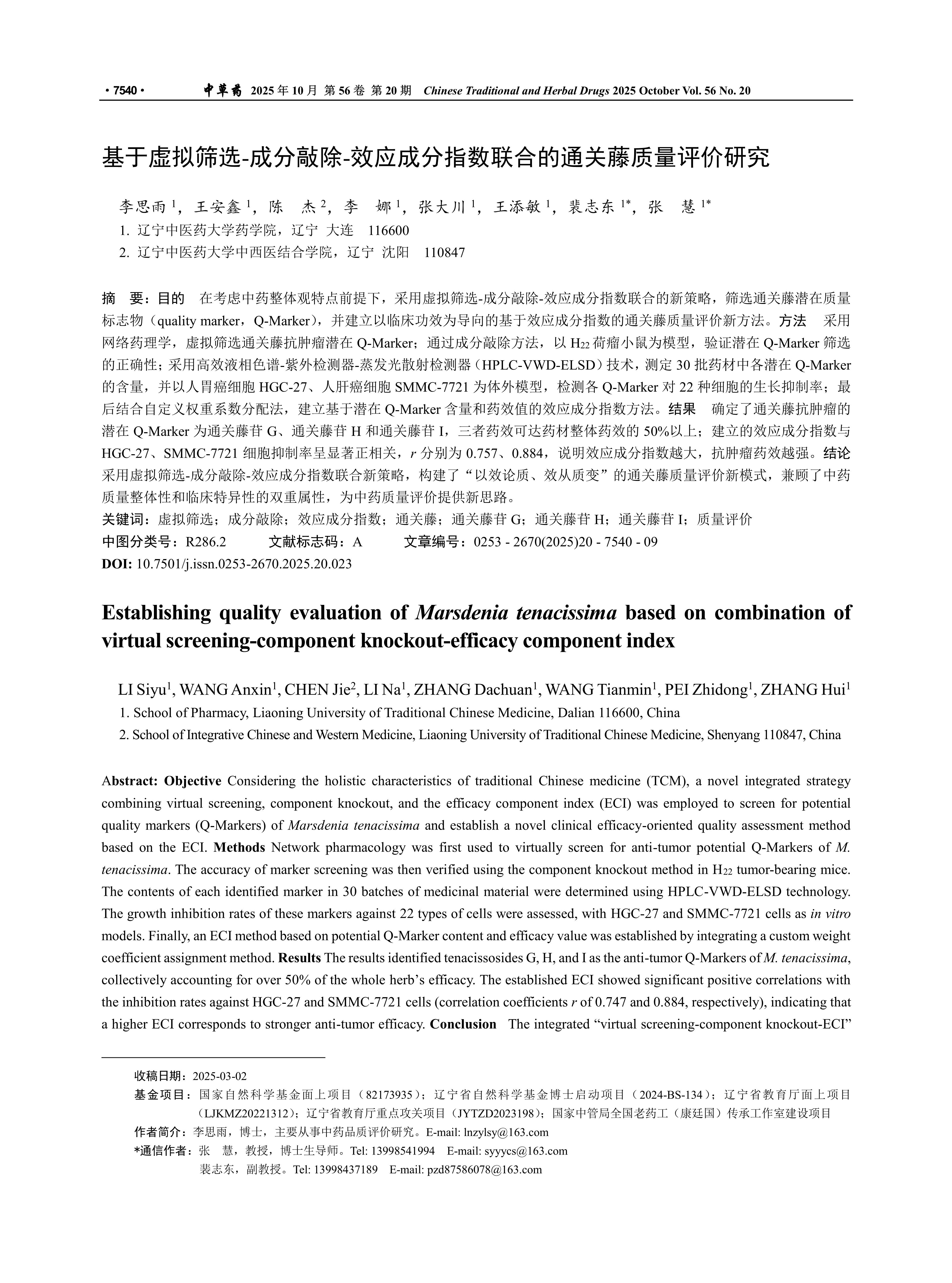 目的 在考虑中药整体观特点前提下,采用虚拟筛选-成分敲除-效应成分指数联合的新策略,筛选通关藤潜在质量标志物(quality marker,Q-Marker),并建立以临床功效为导向的基于效应成分指数的通关藤质量评价新方法。方法 采用网络药理学,虚拟筛选通关藤抗肿瘤潜在Q-Marker;通过成分敲除方法,以H22荷瘤小鼠为模型,验证潜在Q-Marker筛选的正确性;采用高效液相色谱-紫外检测器-蒸发光散射检测器(HPLC-VWD-ELSD)技术,测定30批药材中各潜在Q-Marker的含量,并以人胃癌细胞HGC-27、人肝癌细胞SMMC-7721为体外模型,检测各Q-Marker对22种细胞的生长抑制率;最后结合自定义权重系数分配法,建立基于潜在Q-Marker含量和药效值的效应成分指数方法。结果 确定了通关藤抗肿瘤的潜在Q-Marker为通关藤苷G、通关藤苷H和通关藤苷I,三者药效可达药材整体药效的50%以上;建立的效应成分指数与HGC-27、SMMC-7721细胞抑制率呈显著正相关,r分别为0.757、0.884,说明效应成分指数越大,抗肿瘤药效越强。结论 采用虚拟筛选-成分敲除-效应成分指数联合新策略,构建了“以效论质、效从质变”的通关藤质量评价新模式,兼顾了中药质量整体性和临床特异性的双重属性,为中药质量评价提供新思路。