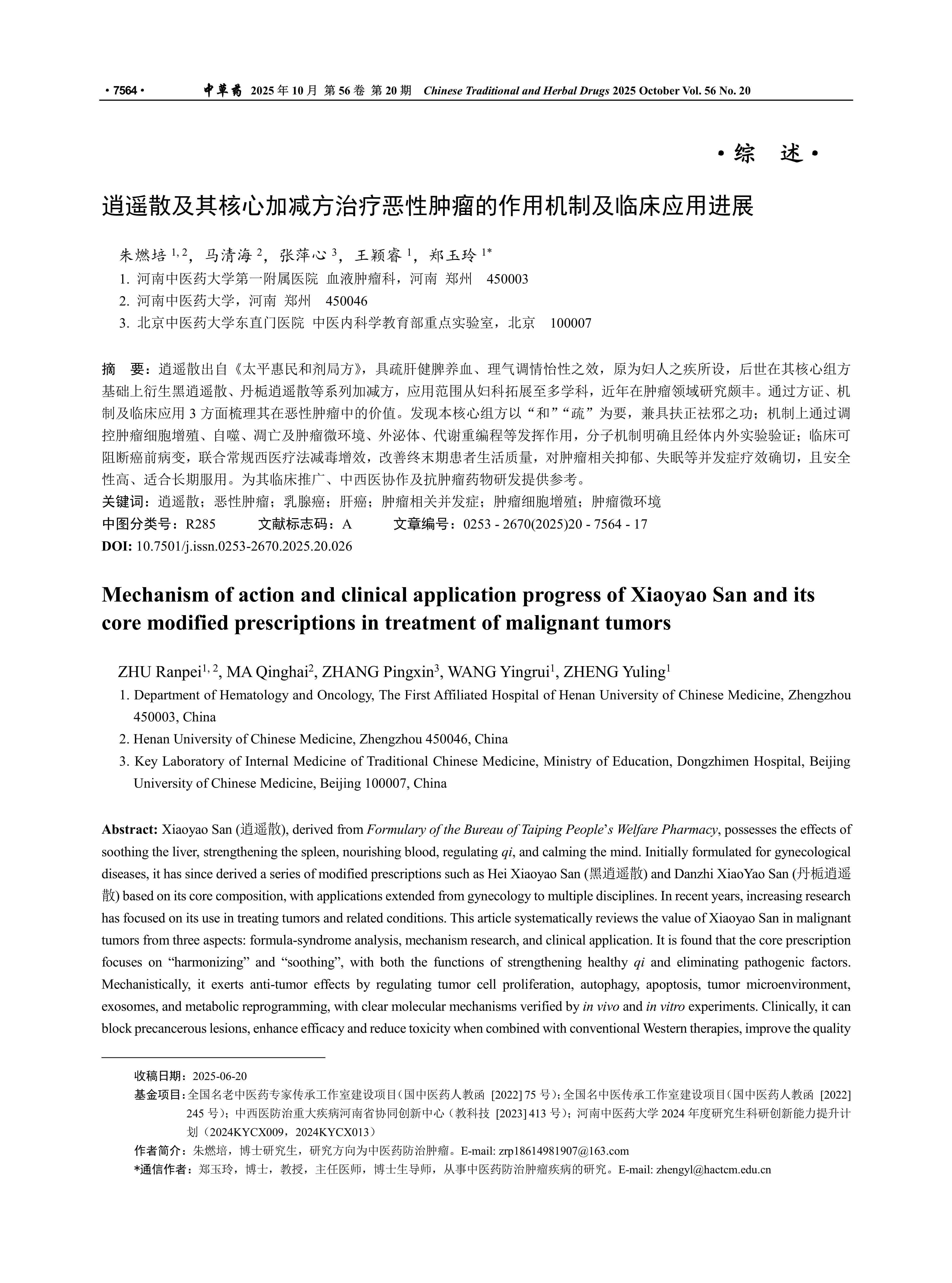 逍遥散出自《太平惠民和剂局方》,具疏肝健脾养血、理气调情怡性之效,原为妇人之疾所设,后世在其核心组方基础上衍生黑逍遥散、丹栀逍遥散等系列加减方,应用范围从妇科拓展至多学科,近年在肿瘤领域研究颇丰。通过方证、机制及临床应用3方面梳理其在恶性肿瘤中的价值。发现本核心组方以“和”“疏”为要,兼具扶正祛邪之功;机制上通过调控肿瘤细胞增殖、自噬、凋亡及肿瘤微环境、外泌体、代谢重编程等发挥作用,分子机制明确且经体内外实验验证;临床可阻断癌前病变,联合常规西医疗法减毒增效,改善终末期患者生活质量,对肿瘤相关抑郁、失眠等并发症疗效确切,且安全性高、适合长期服用。为其临床推广、中西医协作及抗肿瘤药物研发提供参考。
