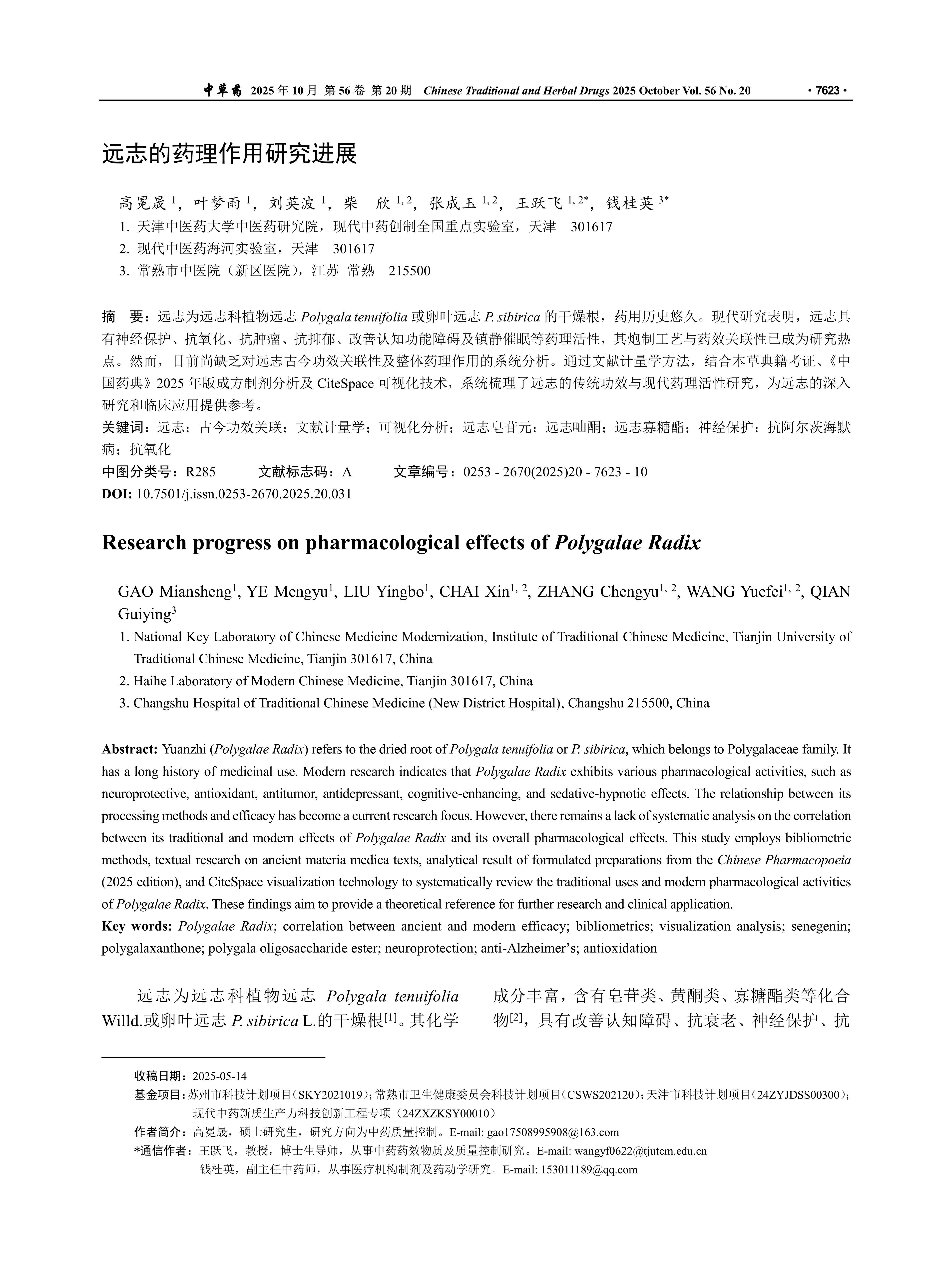 远志为远志科植物远志Polygala tenuifolia或卵叶远志P. sibirica的干燥根,药用历史悠久。现代研究表明,远志具有神经保护、抗氧化、抗肿瘤、抗抑郁、改善认知功能障碍及镇静催眠等药理活性,其炮制工艺与药效关联性已成为研究热点。然而,目前尚缺乏对远志古今功效关联性及整体药理作用的系统分析。通过文献计量学方法,结合本草典籍考证、《中国药典》2025年版成方制剂分析及CiteSpace可视化技术,系统梳理了远志的传统功效与现代药理活性研究,为远志的深入研究和临床应用提供参考。