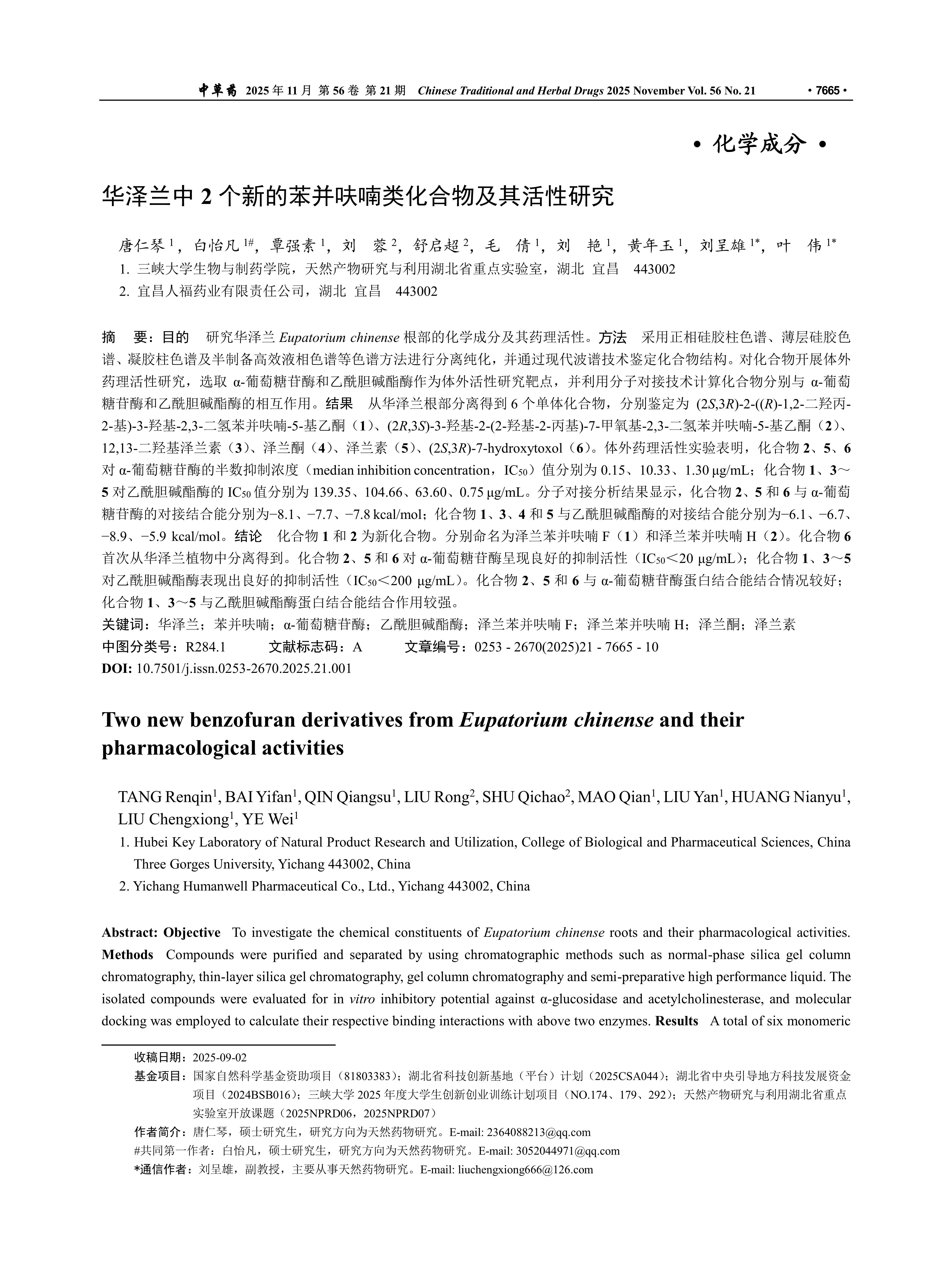 国家自然科学基金资助项目(81803383);湖北省科技创新基地(平台)计划(2025CSA044);湖北省中央引导地方科技发展资金项目(2024BSB016);三峡大学2025年度大学生创新创业训练计划项目(NO.174、179、292);天然产物研究与利用湖北省重点实验室开放课题(2025NPRD06,2025NPRD07)