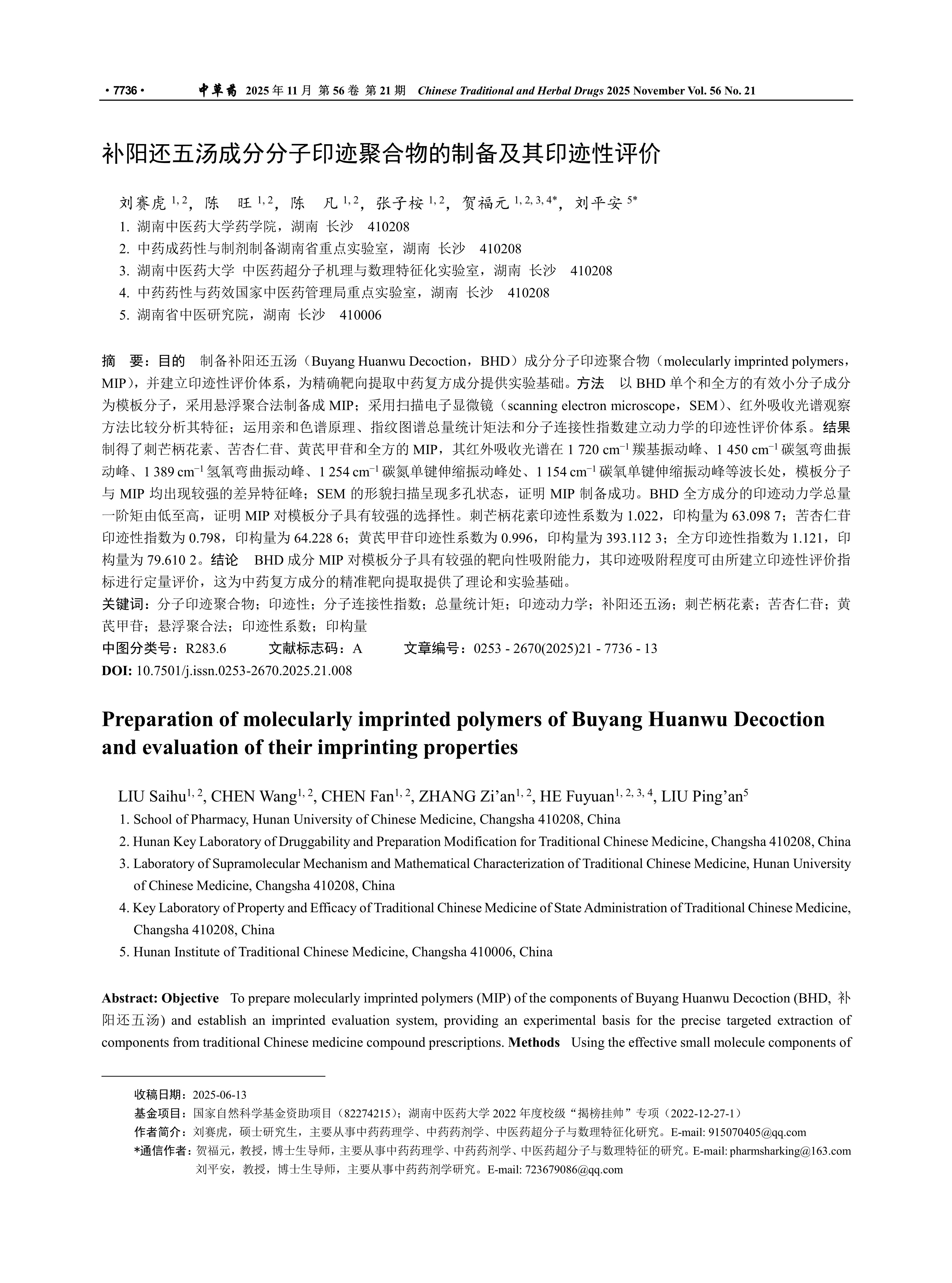 目的 制备补阳还五汤(Buyang Huanwu Decoction,BHD)成分分子印迹聚合物(molecularly imprinted polymers,MIP),并建立印迹性评价体系,为精确靶向提取中药复方成分提供实验基础。方法 以BHD单个和全方的有效小分子成分为模板分子,采用悬浮聚合法制备成MIP;采用扫描电子显微镜(scanning electron microscope,SEM)、红外吸收光谱观察方法比较分析其特征;运用亲和色谱原理、指纹图谱总量统计矩法和分子连接性指数建立动力学的印迹性评价体系。结果 制得了刺芒柄花素、苦杏仁苷、黄芪甲苷和全方的MIP,其红外吸收光谱在1 720 cm−1羰基振动峰、1 450 cm−1碳氢弯曲振动峰、1 389 cm−1氢氧弯曲振动峰、1 254 cm−1碳氮单键伸缩振动峰处、1 154 cm−1碳氧单键伸缩振动峰等波长处,模板分子与MIP均出现较强的差异特征峰;SEM的形貌扫描呈现多孔状态,证明MIP制备成功。BHD全方成分的印迹动力学总量一阶矩由低至高,证明MIP对模板分子具有较强的选择性。刺芒柄花素印迹性系数为1.022,印构量为63.098 7;苦杏仁苷印迹性指数为0.798,印构量为64.228 6;黄芪甲苷印迹性系数为0.996,印构量为393.112 3;全方印迹性指数为1.121,印构量为79.610 2。结论 HD成分MIP对模板分子具有较强的靶向性吸附能力,其印迹吸附程度可由所建立印迹性评价指标进行定量评价,这为中药复方成分的精准靶向提取提供了理论和实验基础。