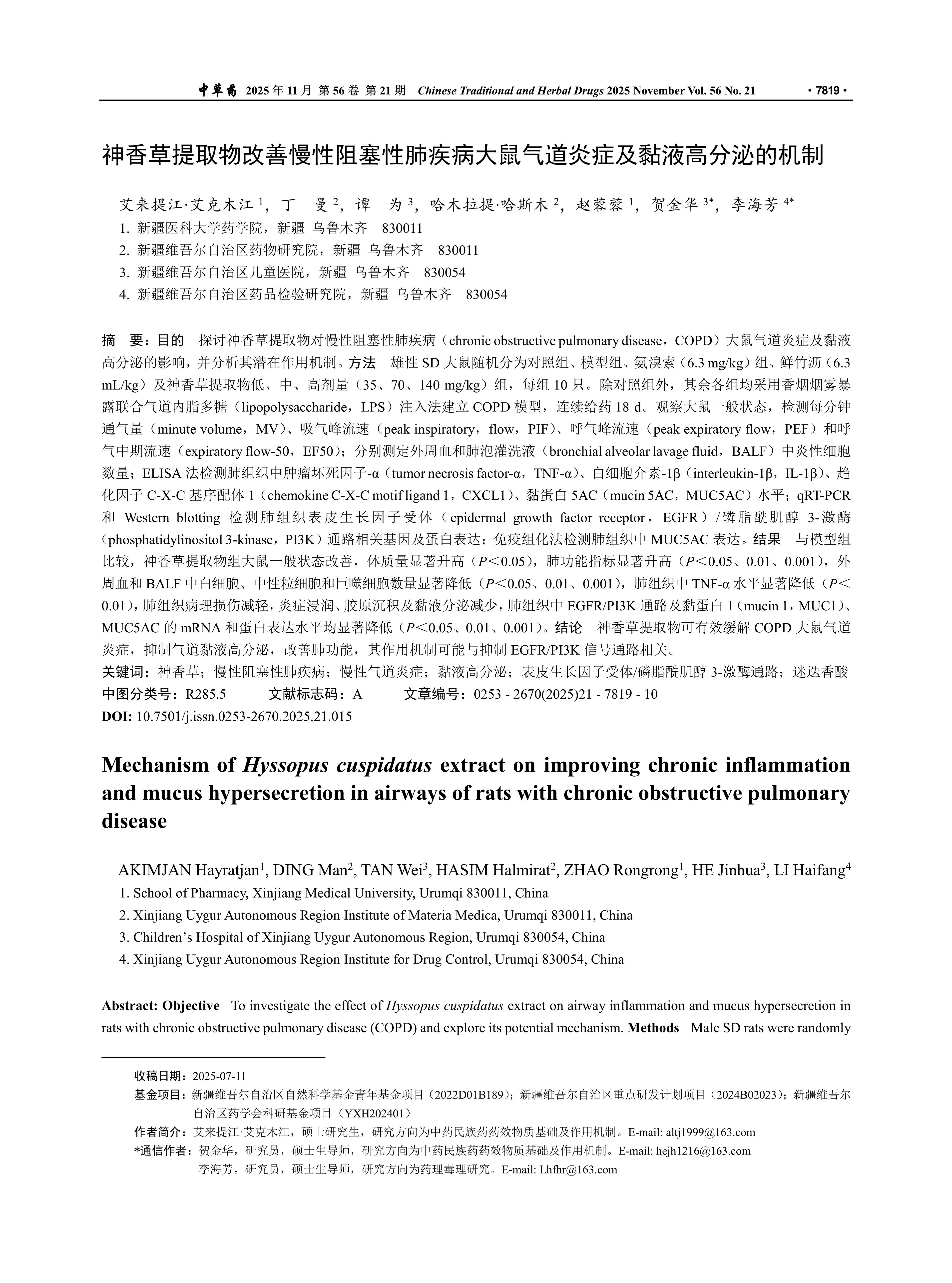 Objective To investigate the effect of Hyssopus cuspidatus extract on airway inflammation and mucus hypersecretion in rats with chronic obstructive pulmonary disease (COPD) and explore its potential mechanism. Methods Male SD rats were randomly divided into control group, model group, ambroxol (6.3 mg/kg) group, succus bambusae (6.3 mL/kg) group and H. cuspidatus extract low-, medium- and high-dose (35, 70, 140 mg/kg) groups, with 10 rats in each group. Except for the control group, COPD model was established by cigarette smoke exposure combined with intratracheal instillation of lipopolysaccharide, after continuous administration for 18 d, the general state of rats was observed, minute volume (MV), peak inspiratory flow (PIF), peak expiratory flow (PEF) and expiratory flow-50 (EF50) were measured. The numbers of inflammatory cells in peripheral blood and bronchoalveolar lavage fluid (BALF) were determined respectively. ELISA method was used to detect the levels of tumor necrosis factor-α (TNF-α), interleukin-1β (IL-1β), chemokine C-X-C motif ligand 1 (CXCL1) and mucin 5AC (MUC5AC) in lung tissue. qRT-PCR and Western blotting were used to detect the expressions of genes and proteins related to the epidermal growth factor receptor (EGFR)/phosphatidylinositol 3-kinase (PI3K) pathway in lung tissue. Immunohistochemistry was used to detect the expression of MUC5AC in lung tissue. Results Compared with model group, the general condition of rats in H. cuspidatus extract group was improved, body weight was significantly increased (P < 0.05), lung function indicators were significantly increased (P < 0.05, 0.01, 0.001), the numbers of white blood cells, neutrophils and macrophages in peripheral blood and BALF were significantly decreased (P < 0.05, 0.01, 0.001), TNF-α level in lung tissue was significantly decreased (P < 0.01), pathological damage in lung tissue was reduced, inflammation infiltration, collagen deposition and mucus secretion were decreased, the mRNA and protein expression levels of EGFR/PI3K pathway, mucin 1 (MUC1) and MUC5AC in lung tissue were significantly reduced (P < 0.05, 0.01, 0.001). Conclusion H. cuspidatus extract could effectively alleviate airway inflammation in COPD rats, inhibit airway mucus hypersecretion, and improve lung function. Its mechanism may be related to the inhibition of EGFR/PI3K signaling pathway.