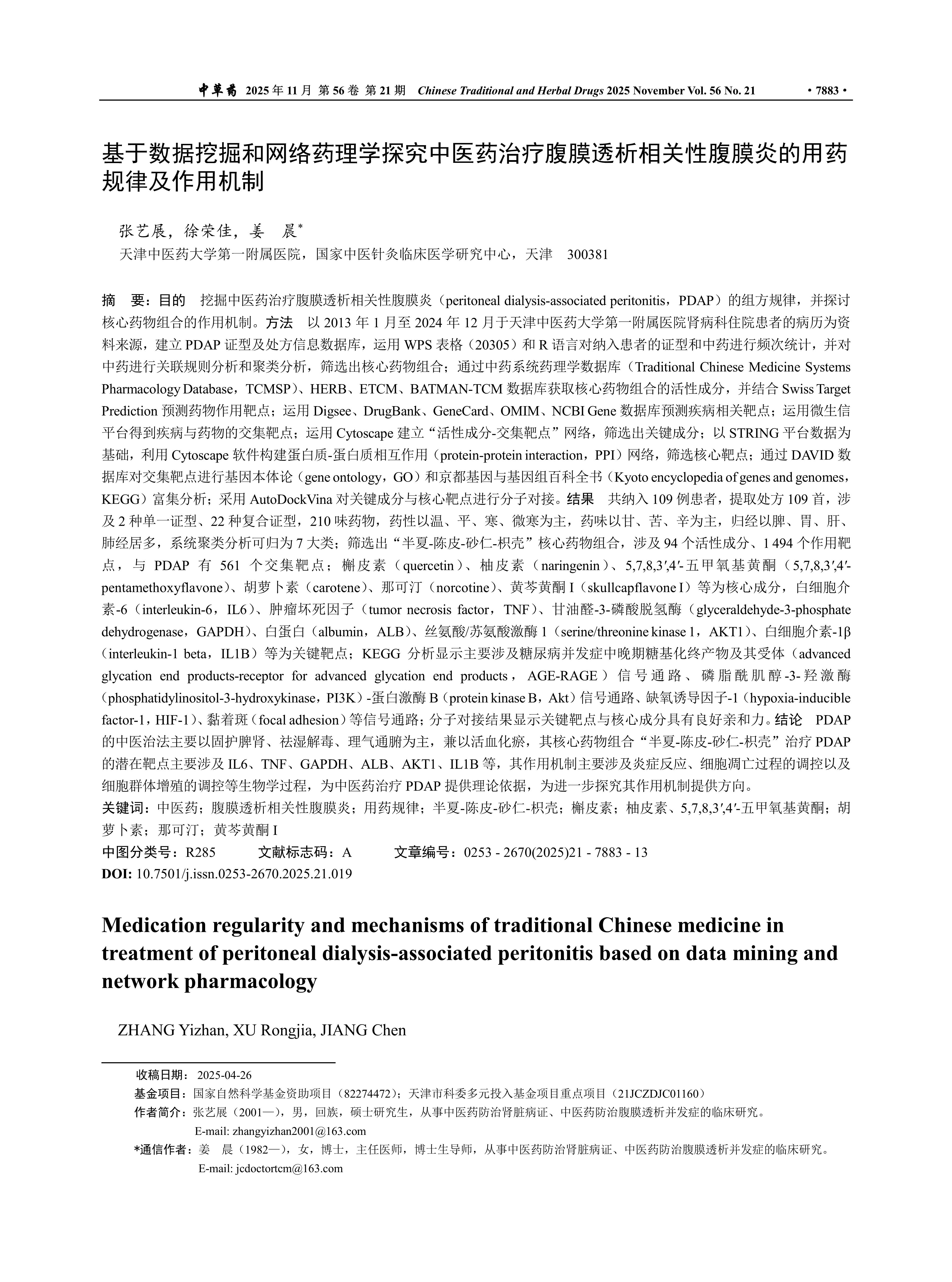 Objective To investigate the formulation patterns of traditional Chinese medicine (TCM) in treating peritoneal dialysis-associated peritonitis (PDAP) and explore the mechanism of action of core drug combinations. Methods Clinical records from PDAP patients hospitalized in the Nephrology Department of First Teaching Hospital of Tianjin University of Traditional Chinese Medicine (January 2013—December 2024) were collected to establish a syndrome-pattern and prescription database. Active components were retrieved from Traditional Chinese Medicine Systems Pharmacology Database (TCMSP), HERB, ETCM, and BATMAN-TCM databases, with target prediction via Swiss Target Prediction. Disease-related targets were identified through Digsee, DrugBank, GeneCard, OMIM and NCBI Gene databases. Intersection targets were obtained using the Weishengxin Bioinformatics Platform. Cytoscape was used to construct “active component-intersection target” networks and protein-protein interaction (PPI) networks, with subsequent screening of key components and core targets. Gene ontology (GO) and Kyoto encyclopedia of genes and genomes (KEGG) enrichment analyses were performed through DAVID database. Molecular docking was conducted using AutoDock Vina. Results The study included 109 patients with 109 prescriptions, involving two single syndrome patterns and 22 compound patterns, comprising 210 herbs. Herbs predominantly exhibited warm, neutral, cold, and slightly cold properties; sweet, bitter, and pungent flavors; and tropism towards spleen, stomach, liver, and lung meridians. Seven clusters were identified through systematic clustering analysis. The core combination “Banxia (Pinelliae Rhizoma)-Chenpi (Citri Reticulatae Pericarpium)-Sharen (Amomi Fructus)-Zhike (Aurantii Fructus)” contained 94 active components and 1 494 targets, with 561 PDAP-related intersection targets. Key components included quercetin, naringenin, 5,7,8,3',4'-pentamethoxyflavone, carotene, norcotine and skullcapflavone I. Core targets included interleukin-6 (IL6), tumor necrosis factor (TNF), glyceraldehyde-3-phosphate dehydrogenase (GAPDH), albumin(ALB), serine/threonine kinase 1 (AKT1), and interleukin-1 beta (IL1B). KEGG analysis revealed that the main pathways involved were advanced glycation end products-receptor for advanced glycation end products (AGE-RAGE), phosphatidylinositol-3-hydroxykinase (PI3K)-protein kinase B (Akt), hypoxia-inducible factor-1(HIF-1), focal adhesion, and other signaling pathways. Molecular docking demonstrated strong binding affinity between key targets and core components. Conclusion TCM treatment of PDAP primarily focuses on tonifying and protecting the spleen and kidney, resolving dampness, detoxification, regulating qi, and promoting bowel movement, complemented by blood activation and stasis removal.The potential therapeutic targets of the core herbs combination “Pinelliae Rhizoma-Citri Reticulatae Pericarpium-Amomi Fructus-Aurantii Fructus” in the treatment of PDAP primarily involve IL6, TNF, GAPDH, ALB, AKT1, IL1B, etc. Its mechanism of action primarily involves biological processes such as inflammatory responses, negative regulation of apoptotic process and positive regulation of cell population proliferation,which may provide the theoretical basis for TCM in the treatment of PDAP, and the direction for further study of the potential mechanism.