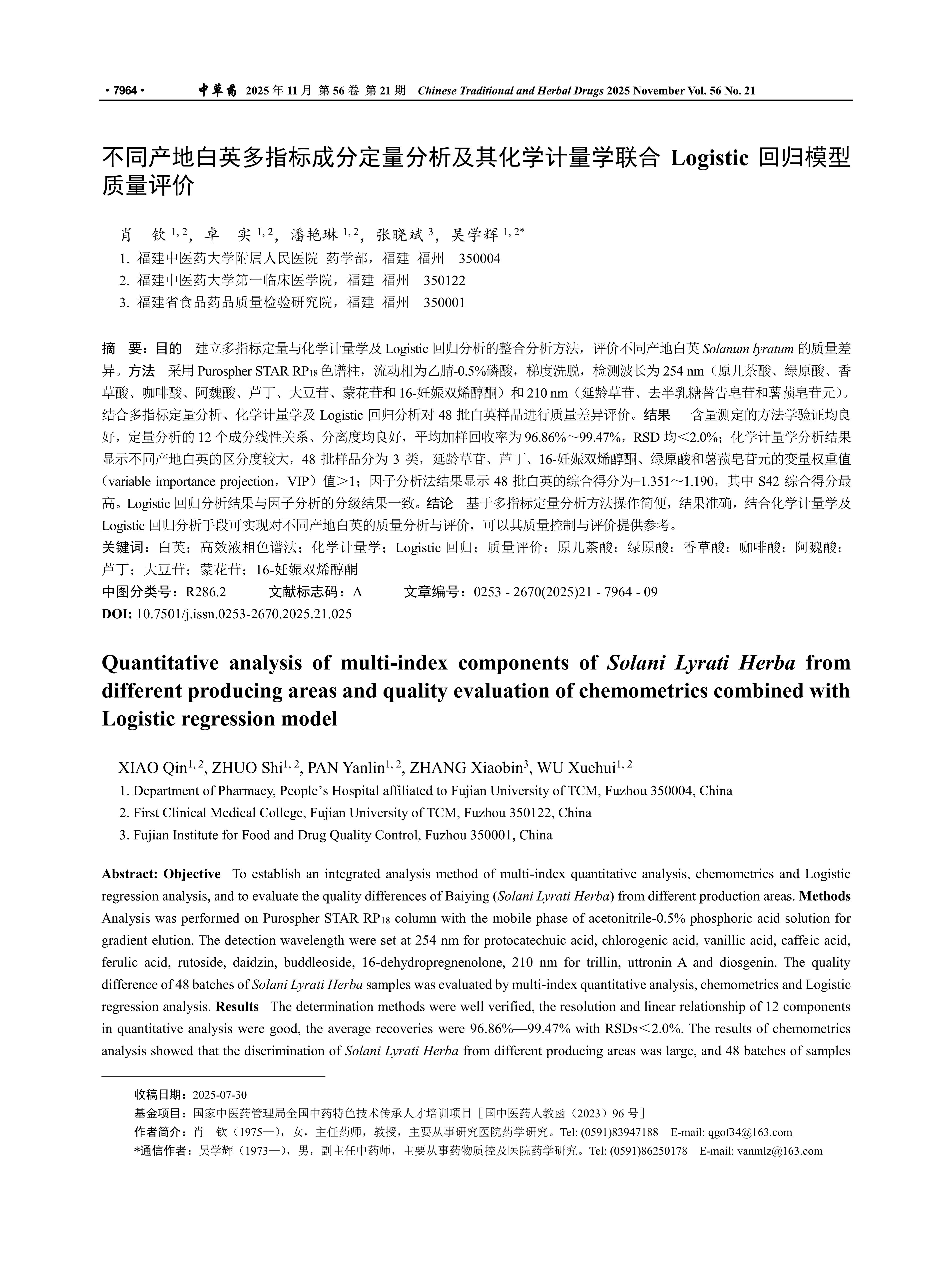 Quantitative analysis of multi-index components of Solani Lyrati Herba from different producing areas and quality evaluation of chemometrics combined with Logistic regression model