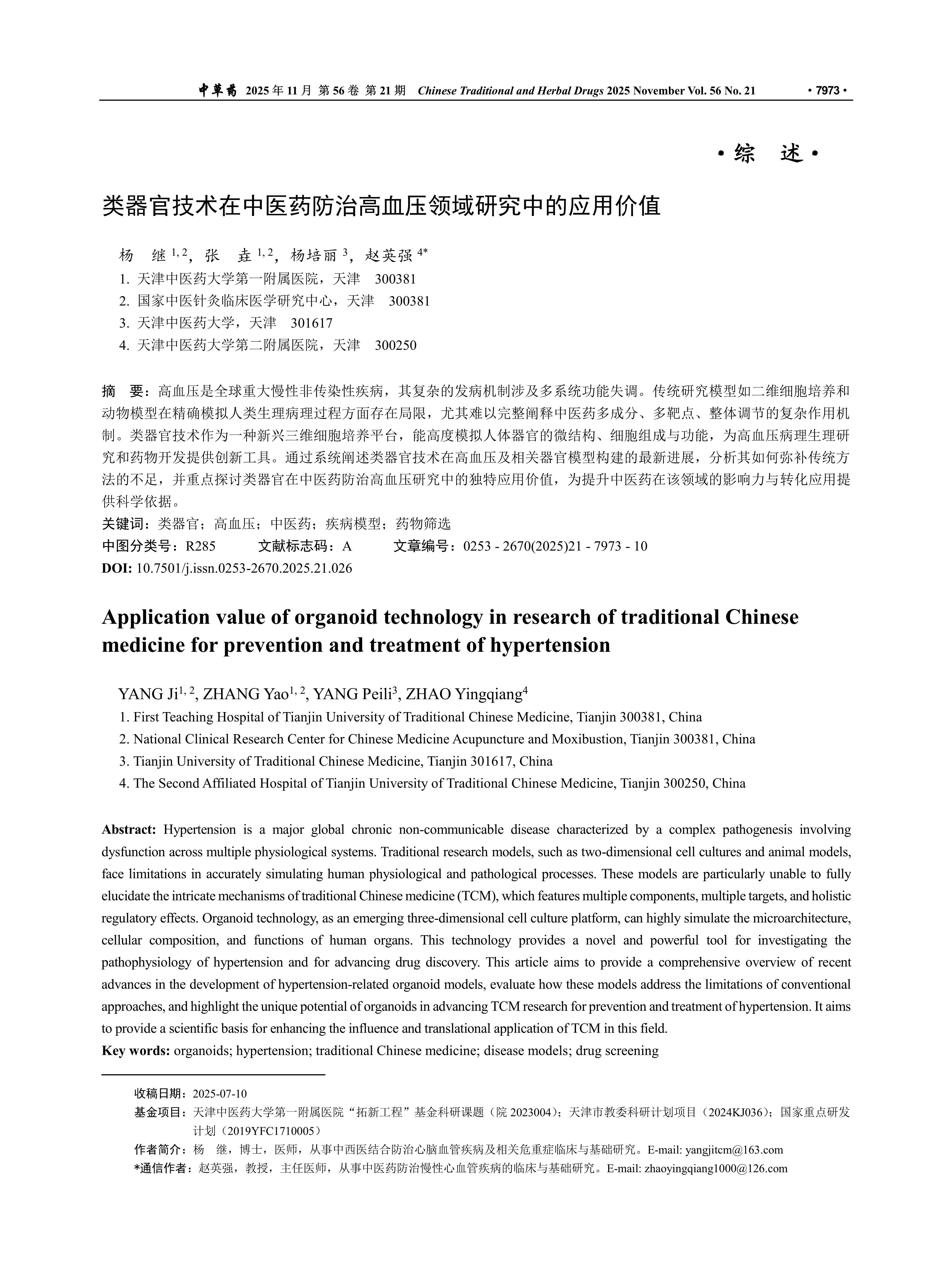 高血压是全球重大慢性非传染性疾病,其复杂的发病机制涉及多系统功能失调。传统研究模型如二维细胞培养和动物模型在精确模拟人类生理病理过程方面存在局限,尤其难以完整阐释中医药多成分、多靶点、整体调节的复杂作用机制。类器官技术作为一种新兴三维细胞培养平台,能高度模拟人体器官的微结构、细胞组成与功能,为高血压病理生理研究和药物开发提供创新工具。通过系统阐述类器官技术在高血压及相关器官模型构建的最新进展,分析其如何弥补传统方法的不足,并重点探讨类器官在中医药防治高血压研究中的独特应用价值,为提升中医药在该领域的影响力与转化应用提供科学依据。