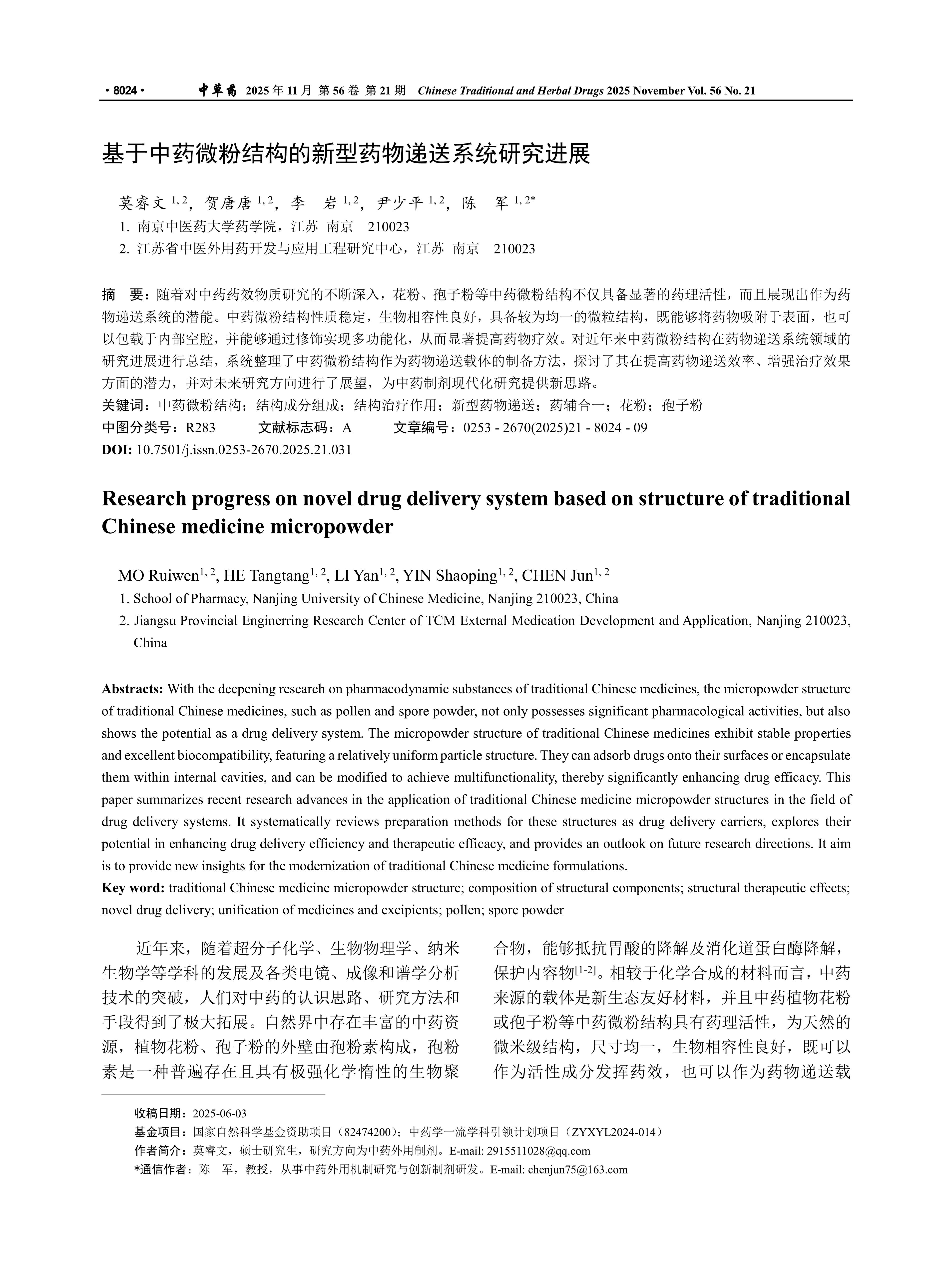 随着对中药药效物质研究的不断深入,花粉、孢子粉等中药微粉结构不仅具备显著的药理活性,而且展现出作为药物递送系统的潜能。中药微粉结构性质稳定,生物相容性良好,具备较为均一的微粒结构,既能够将药物吸附于表面,也可以包载于内部空腔,并能够通过修饰实现多功能化,从而显著提高药物疗效。对近年来中药微粉结构在药物递送系统领域的研究进展进行总结,系统整理了中药微粉结构作为药物递送载体的制备方法,探讨了其在提高药物递送效率、增强治疗效果方面的潜力,并对未来研究方向进行了展望,为中药制剂现代化研究提供新思路。