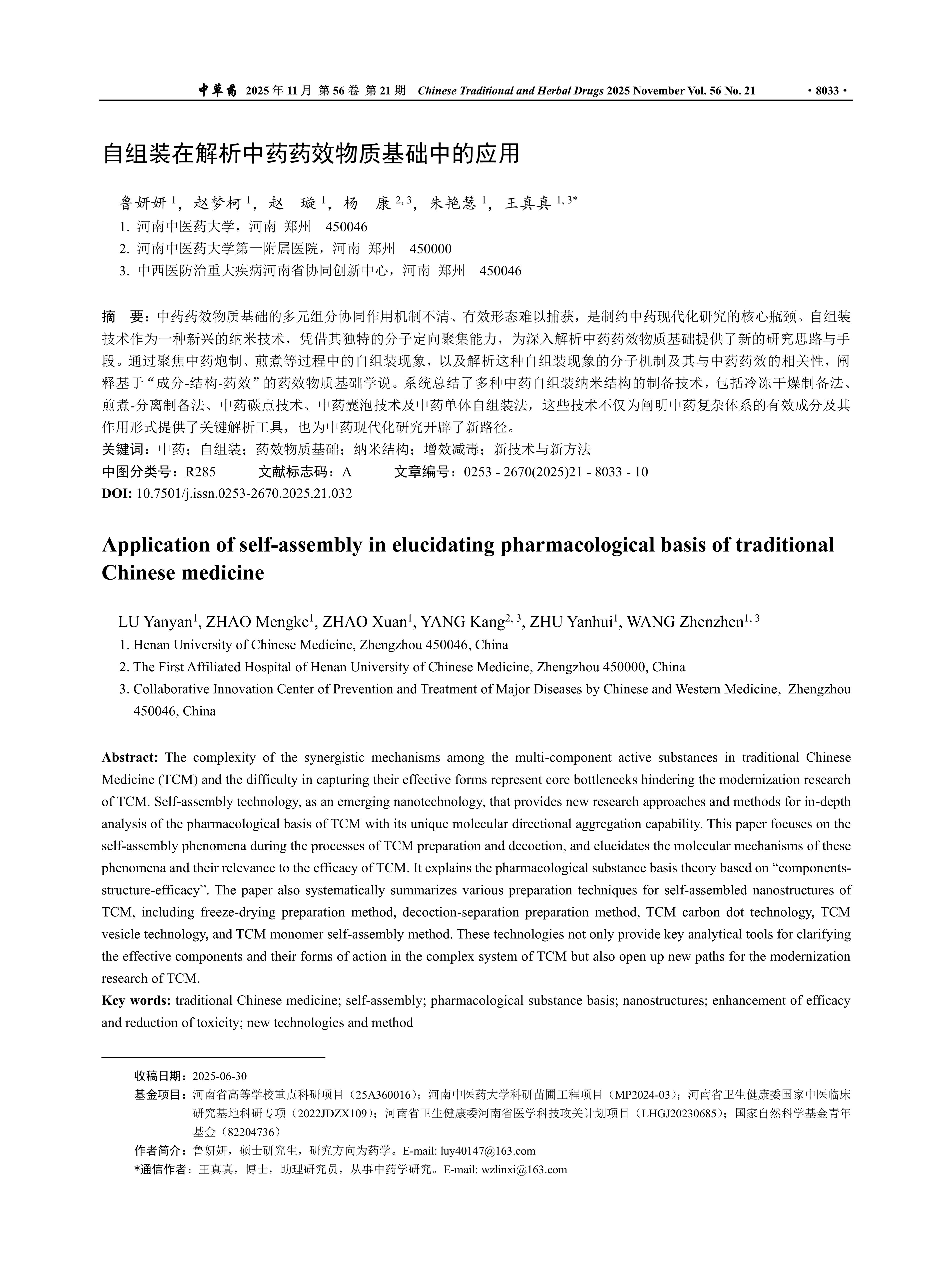 中药药效物质基础的多元组分协同作用机制不清、有效形态难以捕获,是制约中药现代化研究的核心瓶颈。自组装技术作为一种新兴的纳米技术,凭借其独特的分子定向聚集能力,为深入解析中药药效物质基础提供了新的研究思路与手段。通过聚焦中药炮制、煎煮等过程中的自组装现象,以及解析这种自组装现象的分子机制及其与中药药效的相关性,阐释基于“成分-结构-药效”的药效物质基础学说。系统总结了多种中药自组装纳米结构的制备技术,包括冷冻干燥制备法、煎煮-分离制备法、中药碳点技术、中药囊泡技术及中药单体自组装法,这些技术不仅为阐明中药复杂体系的有效成分及其作用形式提供了关键解析工具,也为中药现代化研究开辟了新路径。