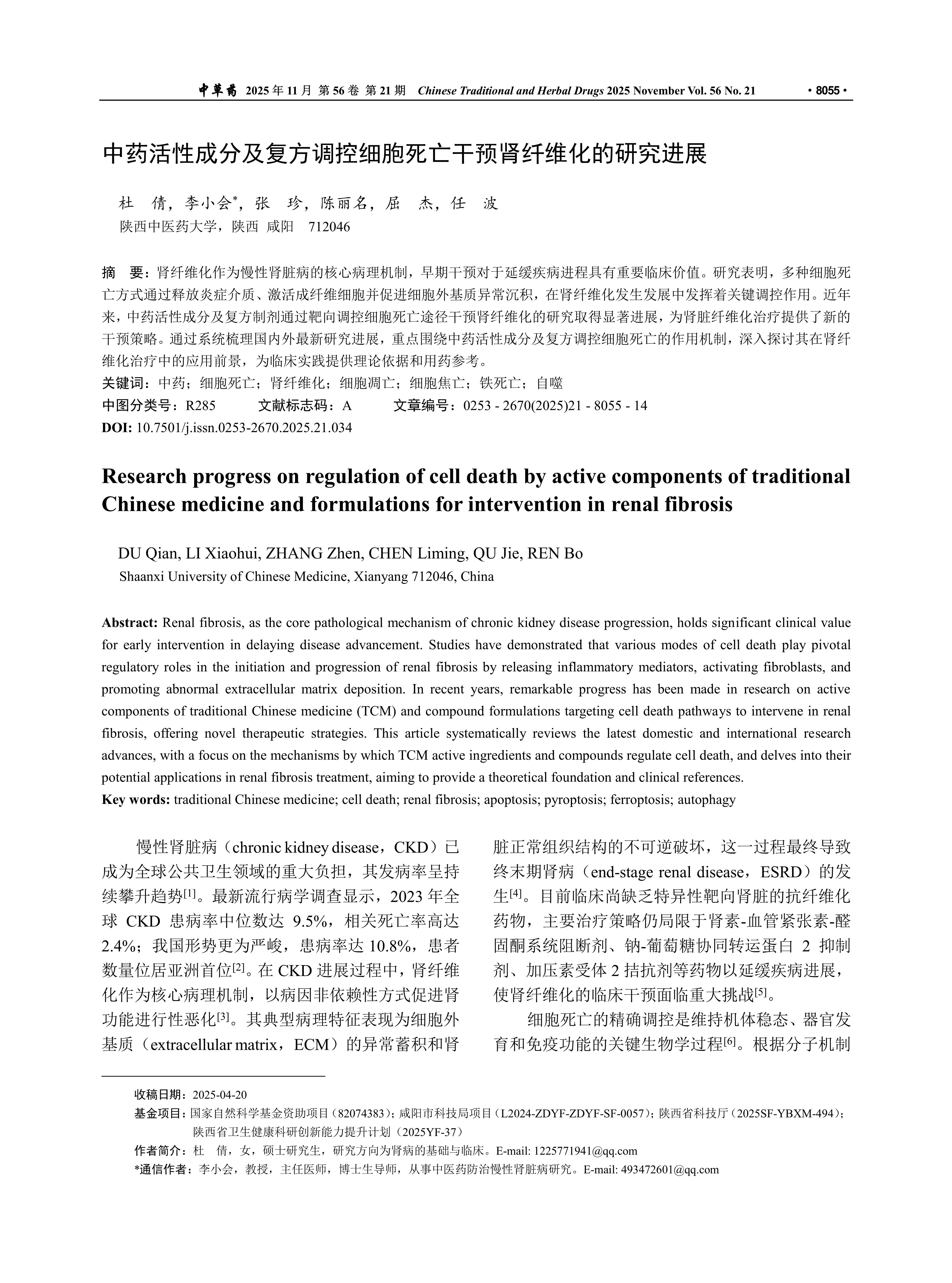 肾纤维化作为慢性肾脏病的核心病理机制,早期干预对于延缓疾病进程具有重要临床价值。研究表明,多种细胞死亡方式通过释放炎症介质、激活成纤维细胞并促进细胞外基质异常沉积,在肾纤维化发生发展中发挥着关键调控作用。近年来,中药活性成分及复方制剂通过靶向调控细胞死亡途径干预肾纤维化的研究取得显著进展,为肾脏纤维化治疗提供了新的干预策略。通过系统梳理国内外最新研究进展,重点围绕中药活性成分及复方调控细胞死亡的作用机制,深入探讨其在肾纤维化治疗中的应用前景,为临床实践提供理论依据和用药参考。