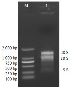 ![]() | M-Marker 1-姜黄总RNA的PCR产物 M-Marker 1-PCR product of total RNA图 1 姜黄叶片总RNAFig. 1 Total RNA of C. longa leaves |