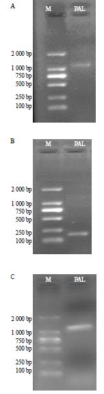 2.2 PAL基因cDNA片段的扩增根据小果野蕉Musa acuminata Colla、生姜Zingiber officinale Rosc等芭蕉目植物PAL基因的序列,设计一对保守序列引物PAL-F和PAL-R(表 1),以上述合成的cDNA第一链为模板,进行PCR扩增。RT-PCR反应体系为0.4 μL的TaKaRa LA Taq(5 U/μL),引物PAL-F(10 μmol/L)和PAL-R(10 μmol/L)各1.0 μL,cDNA 1.0 μL,2.0 μL的dNTP(2.5 mmol/L),2.5 μL的10×缓冲液,17.1 μL 的ddH2O。PCR反应条件:94 ℃预变性5 min;94 ℃变性30 s,53 ℃退火30 s,72 ℃延伸70 s,30个循环;72 ℃延伸7 min。