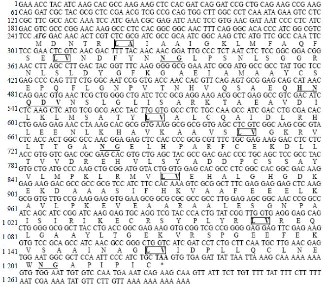 ![]() | 粗、斜体表示起始密码子(ATG);粗体加*表示终止密码子(TAA);脱氨基位点为方框加粗体;催化激活位点为粗体加下划线;左侧数字为核苷酸序号