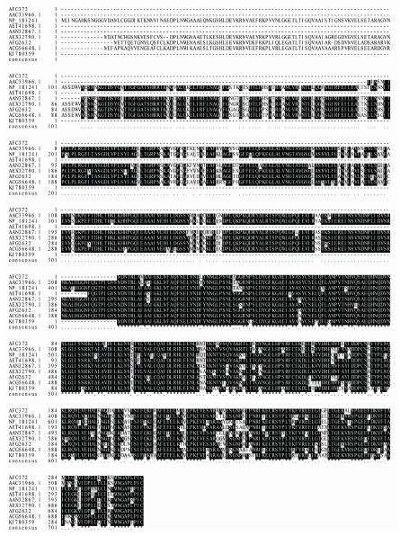 ![]() | AET 41698.1-中国李 NP_181241-拟南芥 AAN32867.1-中粒咖啡 AEX32790.1-葡萄 AFC372-浙江红山茶 AAC33966.1-辣椒