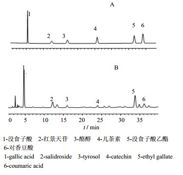 分别精密吸取混合对照品溶液和供试品溶液各10 μL,按上述色谱条件进行测定,计算其中没食子酸、红景天苷、酪醇、儿茶素、没食子酸乙酯、对香豆酸在原药材中的质量分数。结果见表 2。