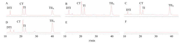 2.1.6 精密度试验取G2号样品,按“2.1.3”项下方法制备的供试品溶液,连续进样6次,记录DTI、CT、TI、TIIA的峰面积,计算各成分峰面积的RSD分别为0.96%、0.98%、1.11%、1.01%,显示仪器精密度良好。